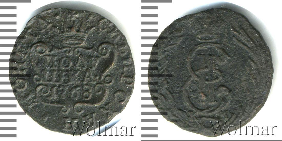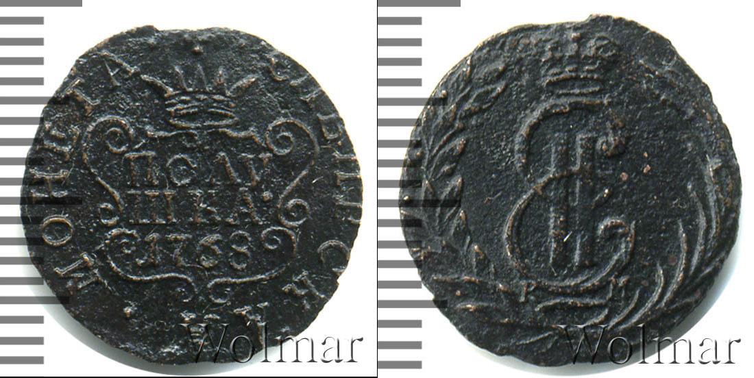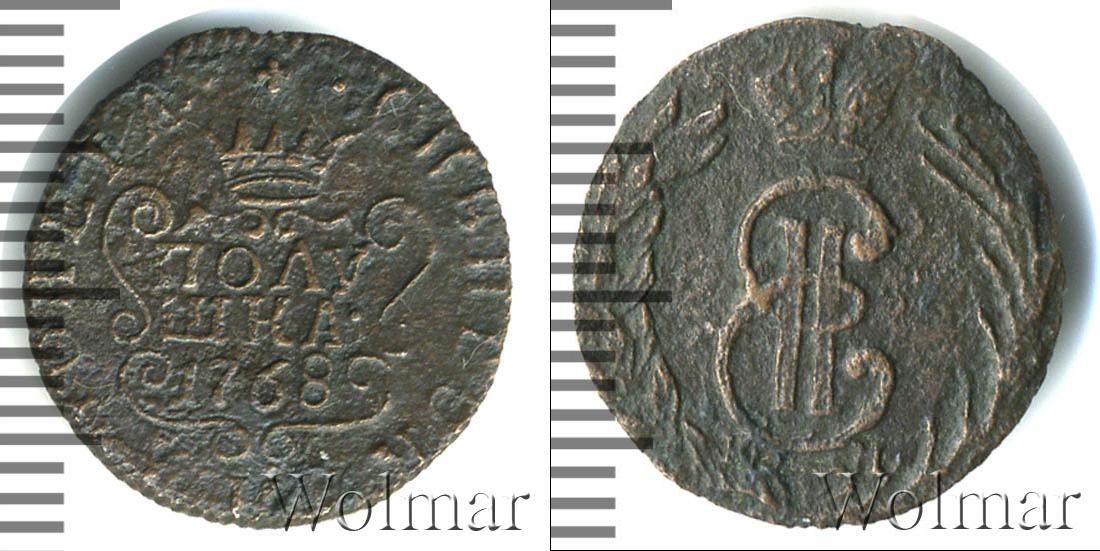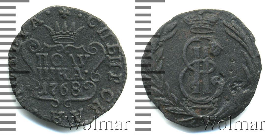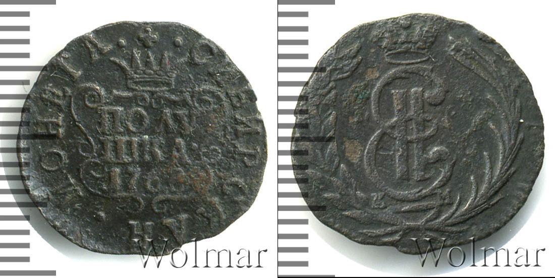 С этой стороны монеты отчеканен картуш в обрамлении узоров. На нем указаны номинал и год выпуска партии «ПОЛУШКА 1768». Вверху показана Имперская корона России. Вдоль канта слева и справа части надписи «МОНЕТА» и «СИБИРСКАЯ».