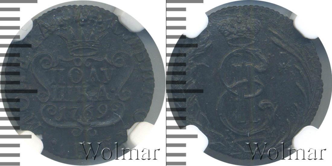 В картуше сделаны отметки о номинале и дате эмиссии партии «ПОЛУШКА 1769». Вверху по центру мы видим корону, а над ней крест. По краю диска выгравировано «МОНЕТА» - слева; «СИБИРСКАЯ» - справа.