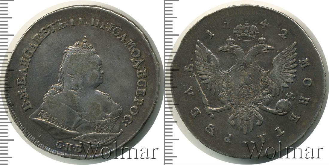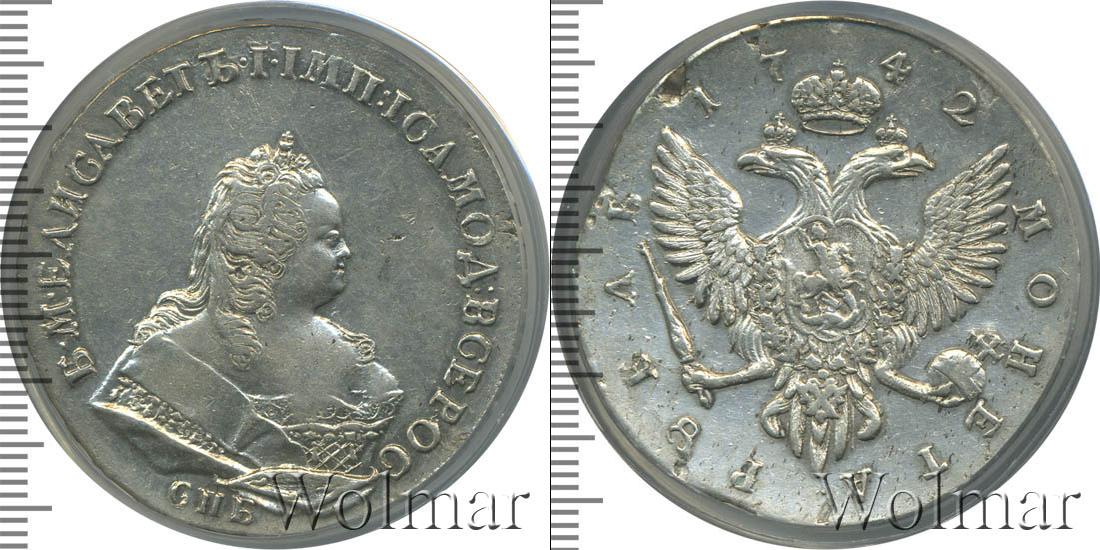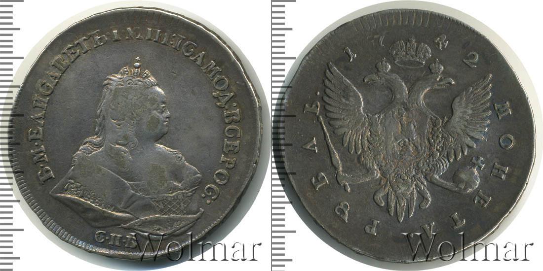 С оборотной стороны монеты: по центру диска изображен двуглавый орел со скипетром и державой. Это герб Российской Империи. Вверху указан год чеканки монеты «1742», а в нижней части диска полукругом указан номинал этой монеты «МОНЕТА РУБЛЬ».