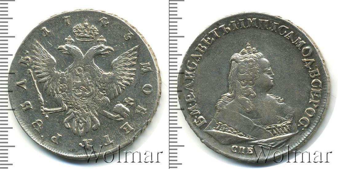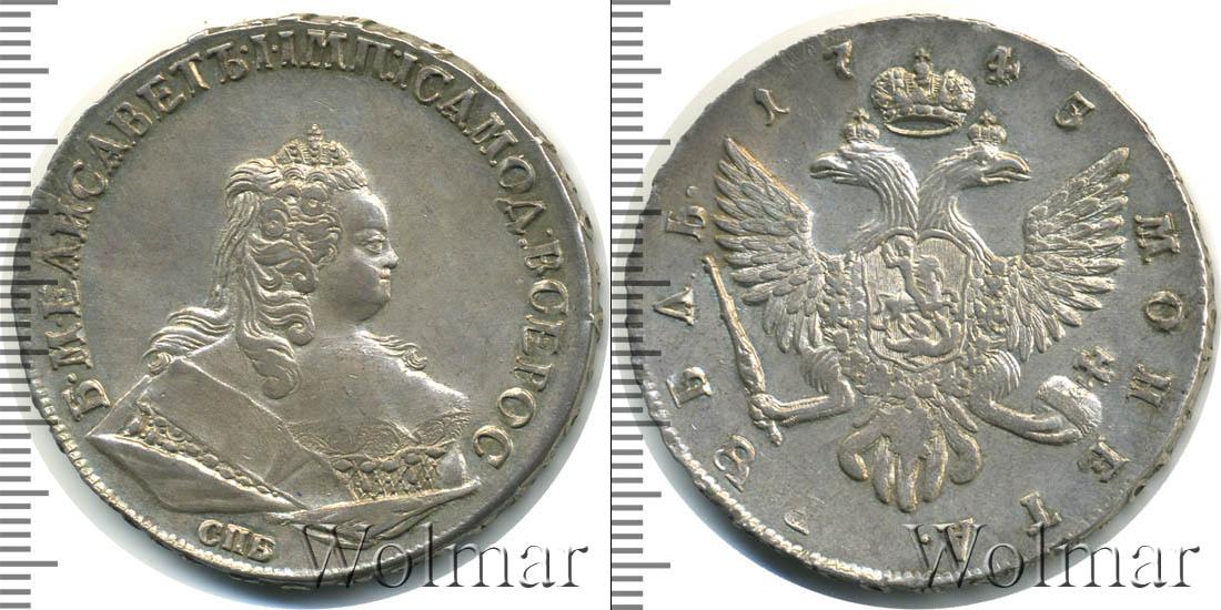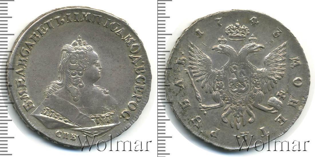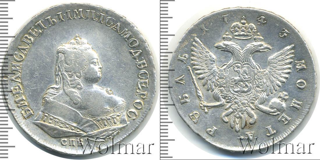Вверху полукругом выгравировано: 1743. Это указание на дату эмиссии монеты. Большую часть диска занимает Государственный герб Российской Империи, а внизу мы видим указание на номинал: МОНЕТА РУБЛЬ.