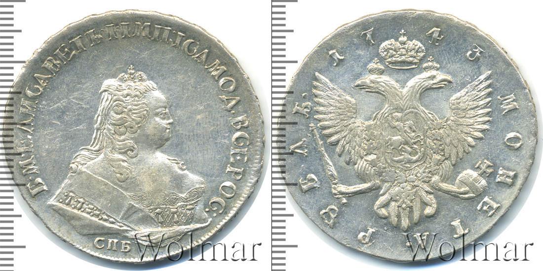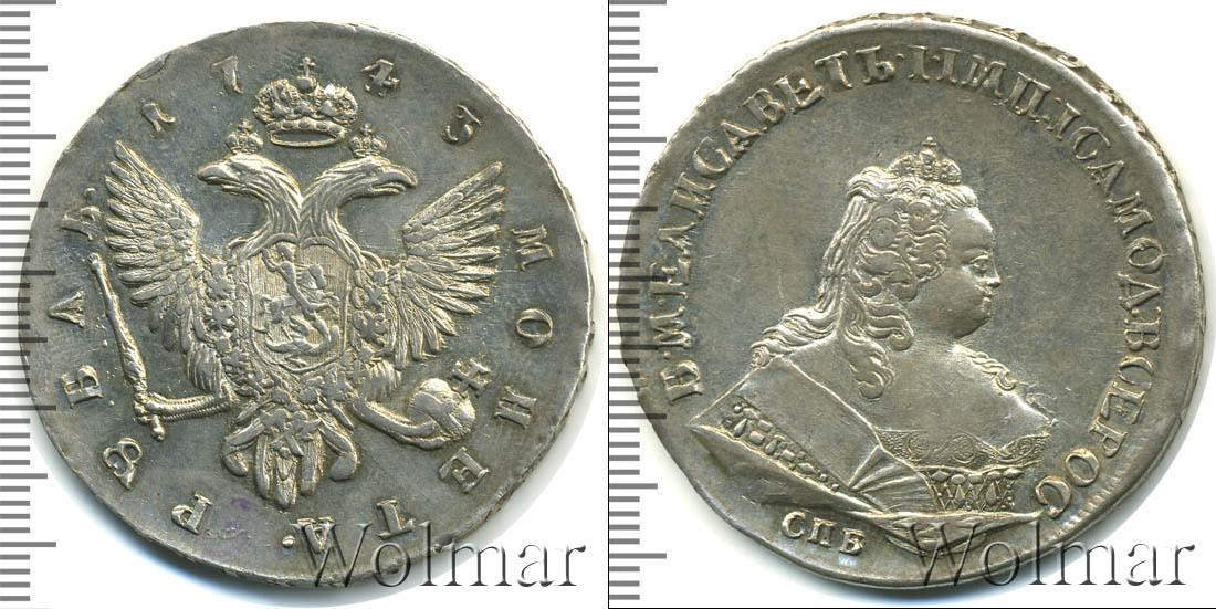 Вверху полукругом выгравировано: 1743. Это указание на дату эмиссии монеты. Большую часть диска занимает Государственный герб Российской Империи, а внизу мы видим указание на номинал: МОНЕТА РУБЛЬ.