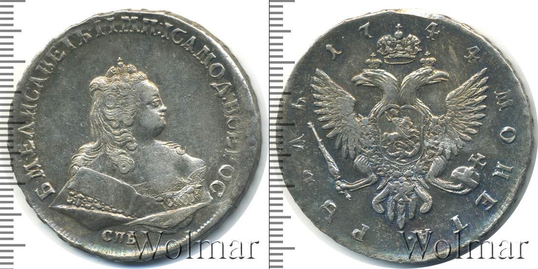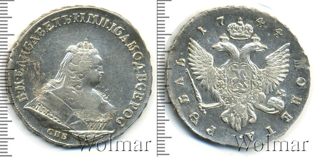 В центральной части диска - гербовая эмблема Российской Империи. Вверху около изображения Большой короны Российской Империи отмечена дата эмиссии партии «1744». По краю идет надпись: МОНЕТА РУБЛЬ. Номинал этой монеты – 1 рубль.
