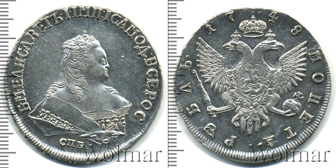 Вверху полукругом начертано: 1748. Это указание на дату эмиссии монеты. Большую часть диска занимает Государственный герб Российской Империи (двуглавый орел со скипетром и державой). Внизу мы видим указание на номинал: МОНЕТА РУБЛЬ.