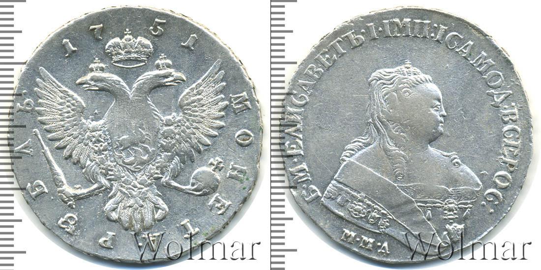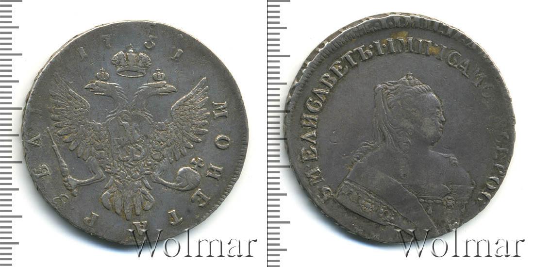 По краю диска вверху расположена надпись: «1751». Таким образом, отмечен год выпуска партии серебряных монет. В центре диска расположен Государственный герб Российской Империи. Рядом начертано «МОНЕТА РУБЛЬ» - указание на номинал.