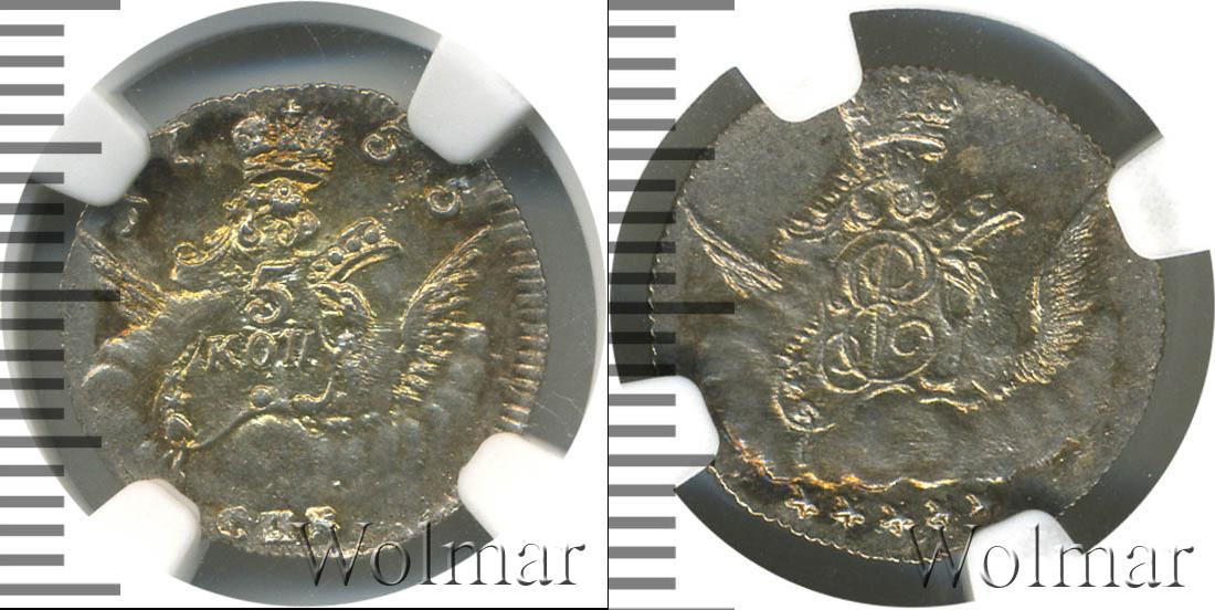 С этой стороны монеты изображен орел, держащий в ключе щит с надписью «5 КОП». Это указание на номинал. Вверху около изображения Большой короны России дата эмиссии партии «1755», а внизу обозначение монетного двора «СПБ».