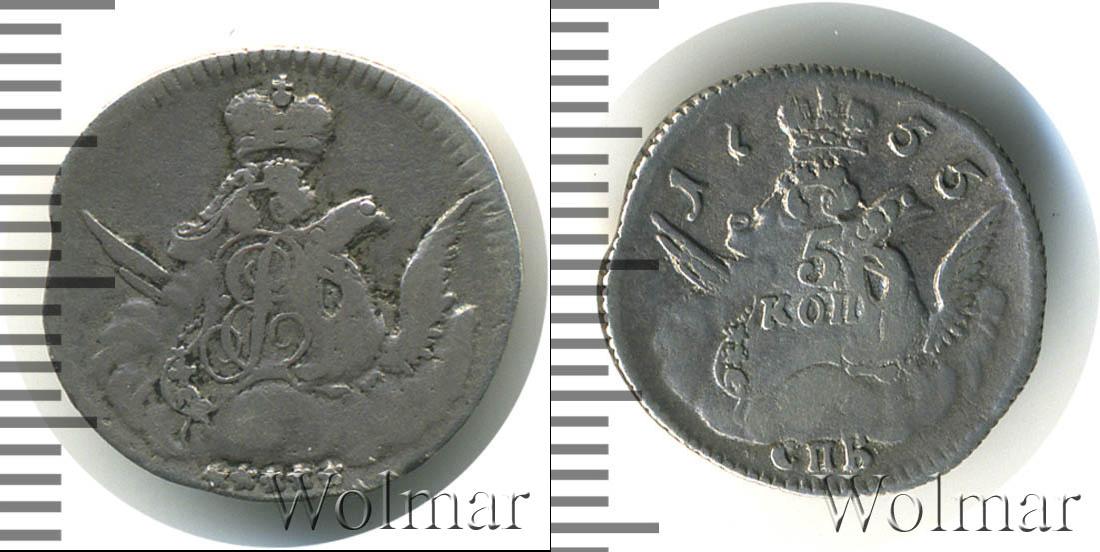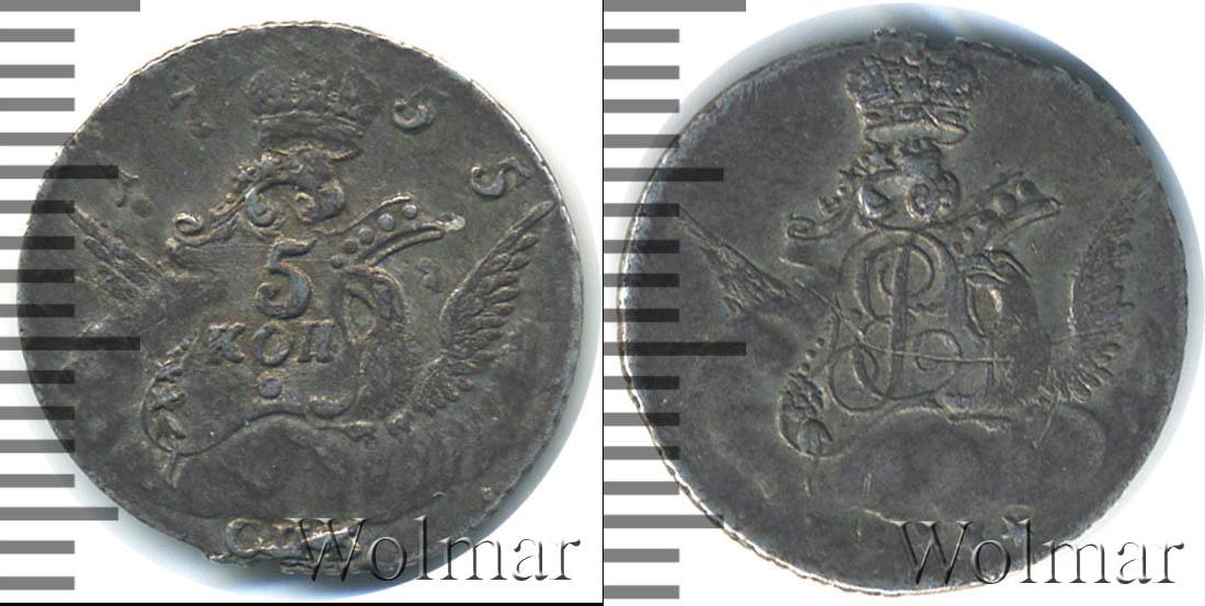 С этой стороны монеты изображен орел, держащий в ключе щит с надписью «5 КОП». Это указание на номинал. Вверху около изображения Большой короны России дата эмиссии партии «1755», а внизу обозначение монетного двора «СПБ».