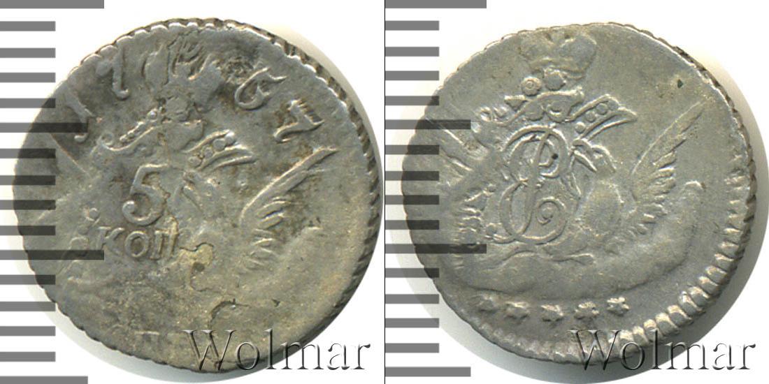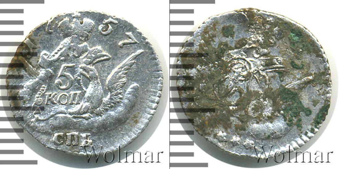 Диск монеты украшает зубчатый орнамент. В центре орел, на правом крыле которого щит с указанием на номинал «5 КОП». Вверху диска мы видим надпись «1757» — это дата эмиссии монеты. Внизу сделана отметка о монетном дворе «СПБ».