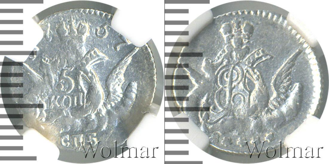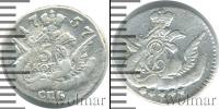 Серебряная монета массой 1,21 г. и диаметром 13,5 мм. Изображен орел с распростертыми крыльями, на одном из которых отчеканен вензель императрицы Елизаветы I. Вверху расположена Большая корона России, а внизу пять звезд, символизирующих номинал монеты (то есть пять копеек).