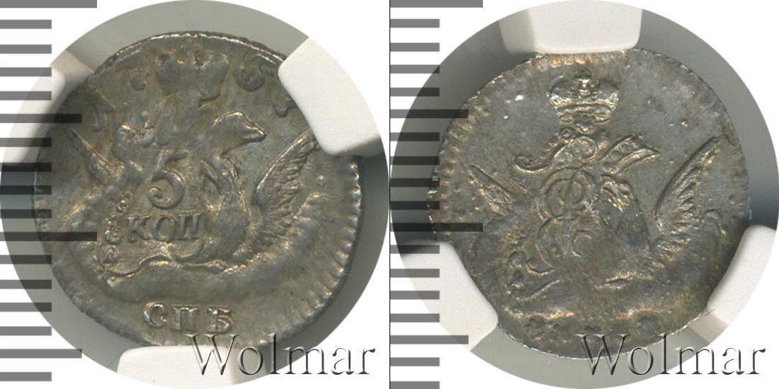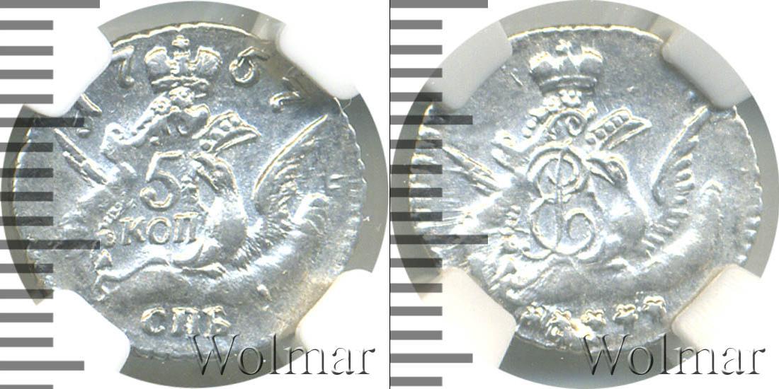 Диск монеты украшает зубчатый орнамент. В центре орел, на правом крыле которого щит с указанием на номинал «5 КОП». Вверху диска мы видим надпись «1757» — это дата эмиссии монеты. Внизу сделана отметка о монетном дворе «СПБ».