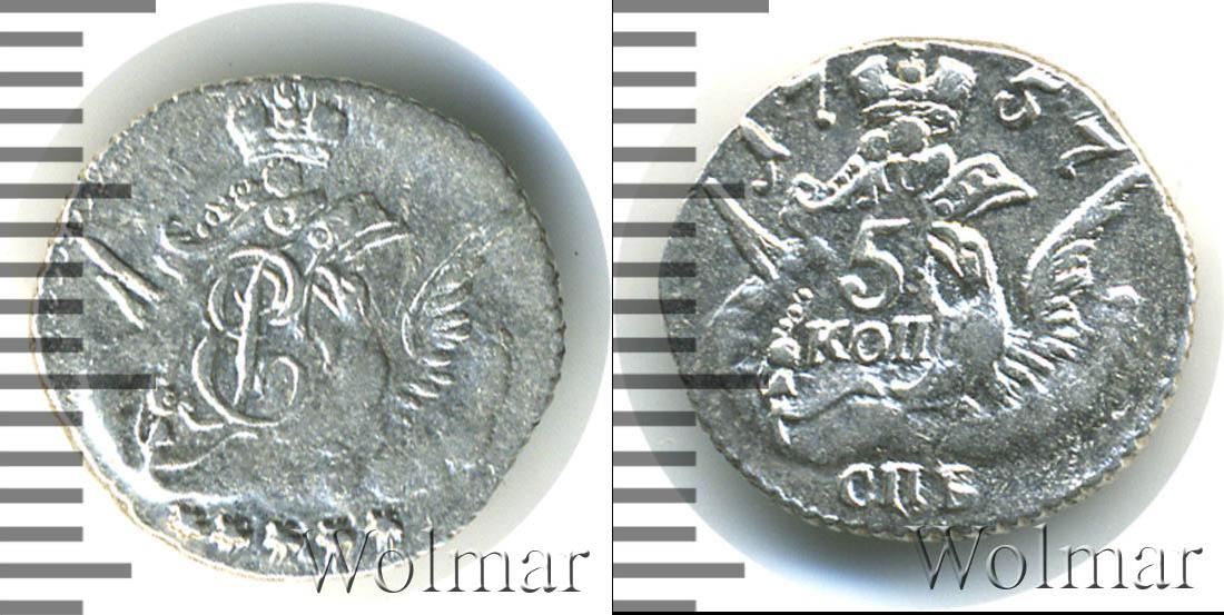 Диск монеты украшает зубчатый орнамент. В центре орел, на правом крыле которого щит с указанием на номинал «5 КОП». Вверху диска мы видим надпись «1757» — это дата эмиссии монеты. Внизу сделана отметка о монетном дворе «СПБ».