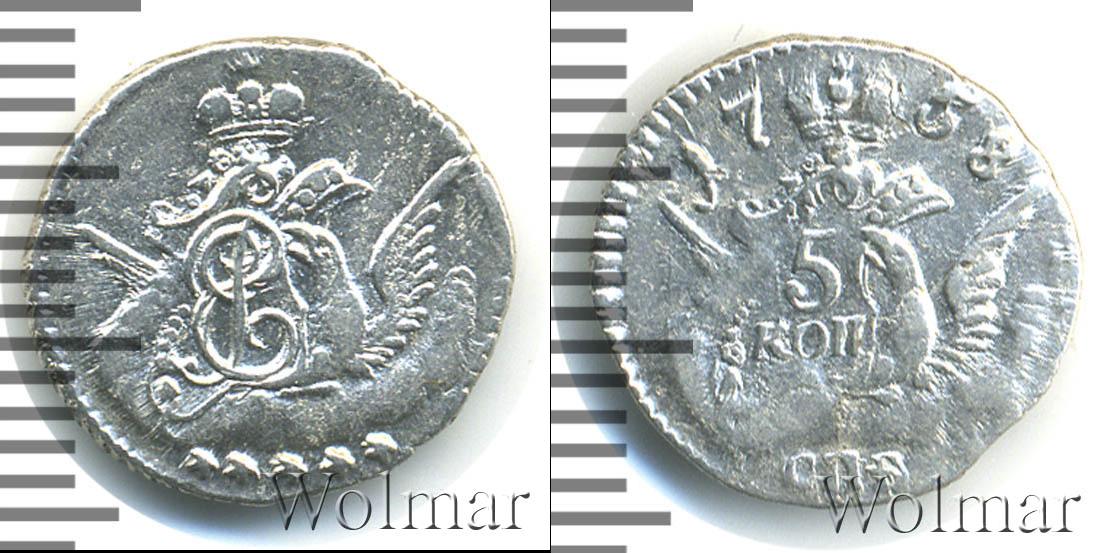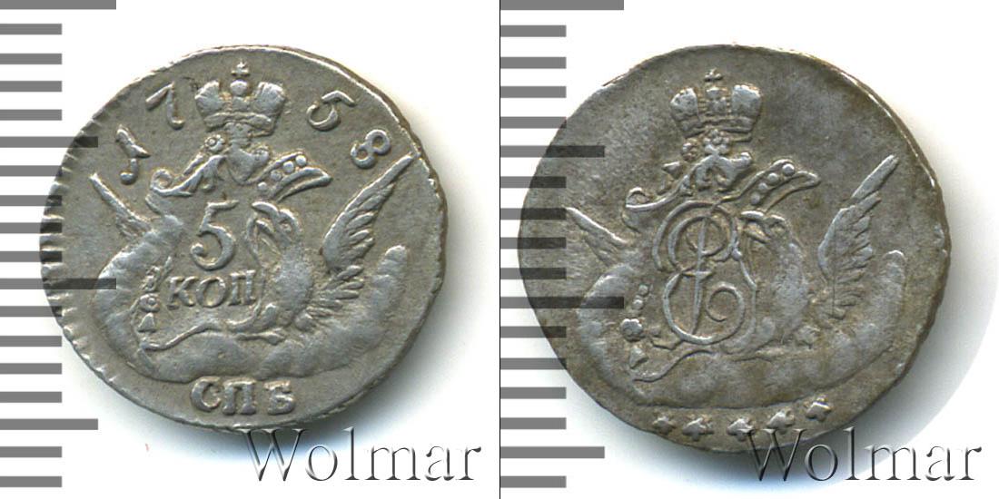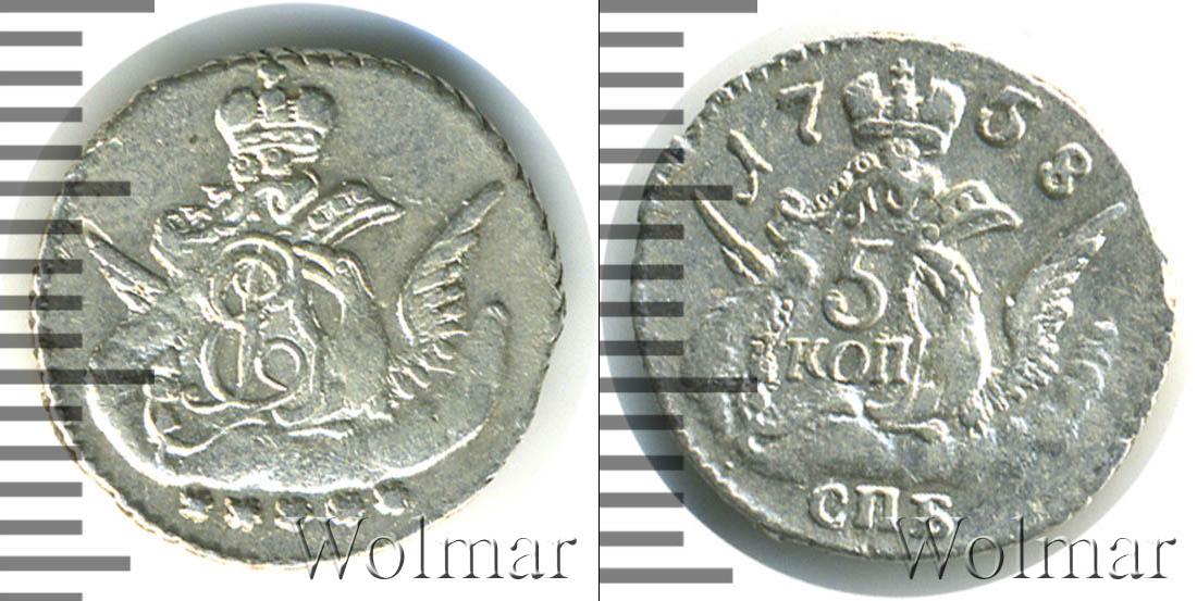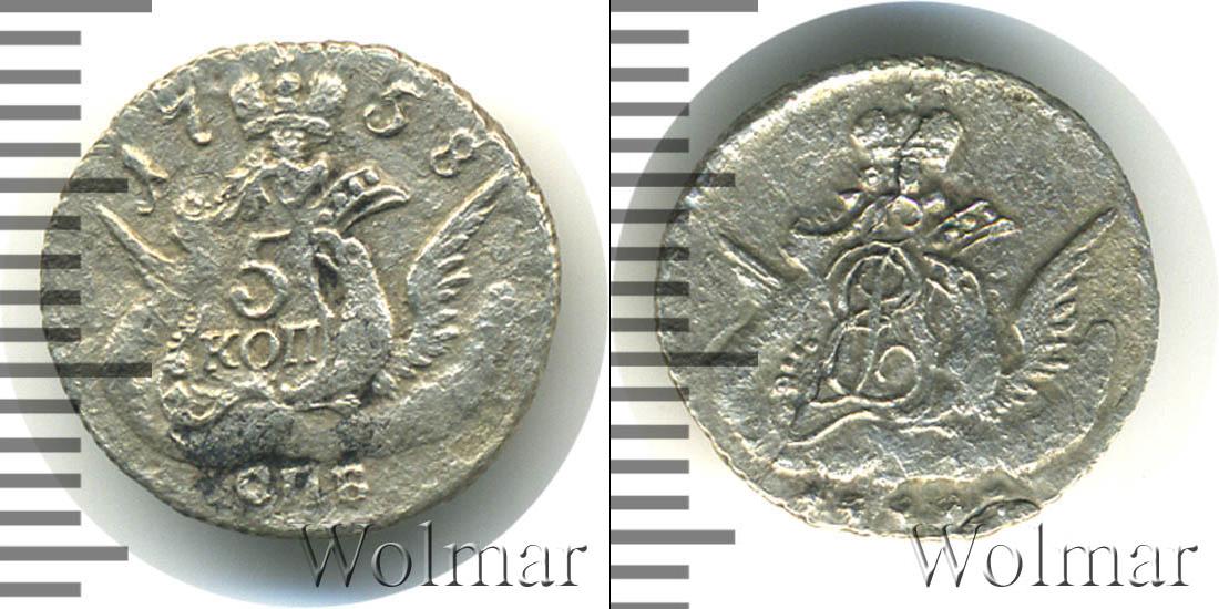 Над изображением орла с распростертыми крыльями расположена Императорская корона России. На одном из крыльев орла сделана отметка о номинале «5 КОП». Вверху отмечен год выпуска монеты «1758», а внизу обозначение монетного двора «СПБ».