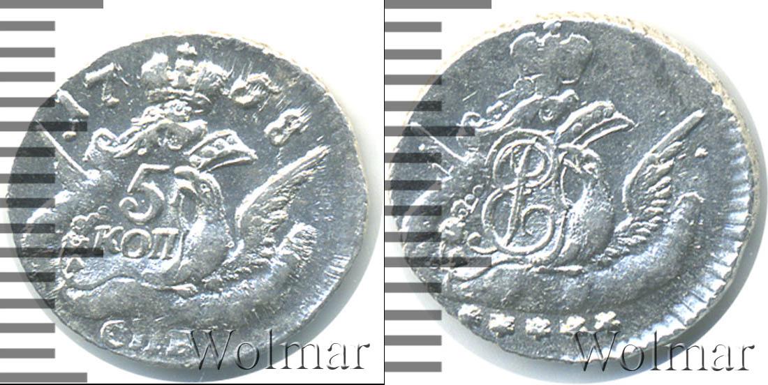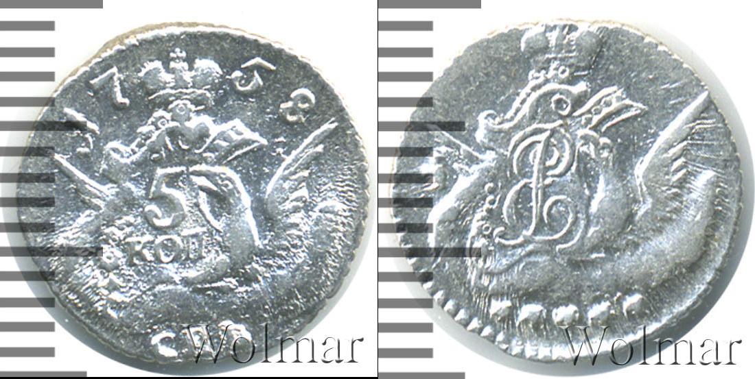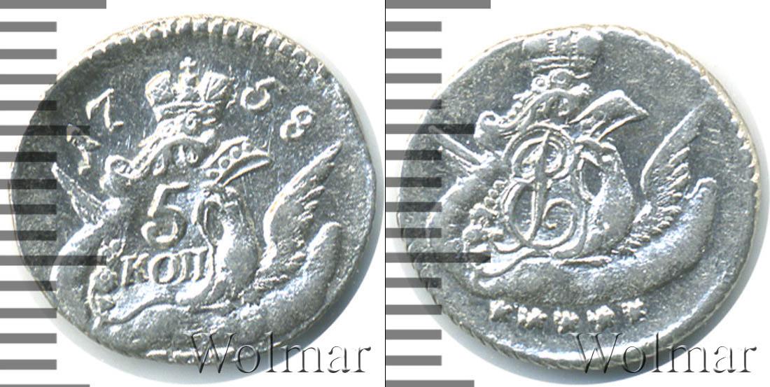 Над изображением орла с распростертыми крыльями расположена Императорская корона России. На одном из крыльев орла сделана отметка о номинале «5 КОП». Вверху отмечен год выпуска монеты «1758», а внизу обозначение монетного двора «СПБ».
