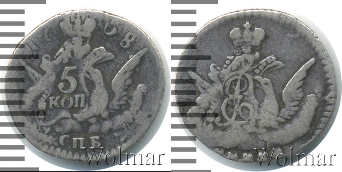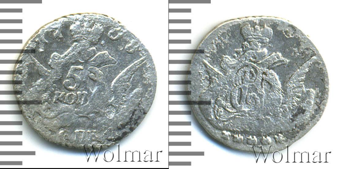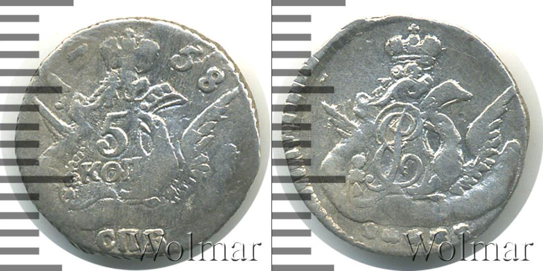 Над изображением орла с распростертыми крыльями расположена Императорская корона России. На одном из крыльев орла сделана отметка о номинале «5 КОП». Вверху отмечен год выпуска монеты «1758», а внизу обозначение монетного двора «СПБ».