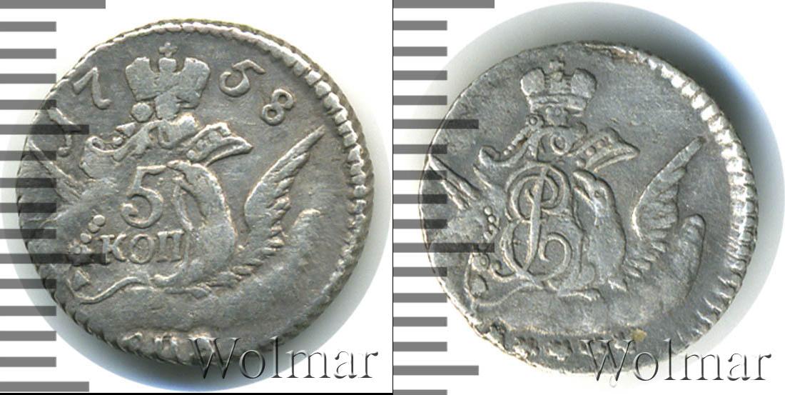 Над изображением орла с распростертыми крыльями расположена Императорская корона России. На одном из крыльев орла сделана отметка о номинале «5 КОП». Вверху отмечен год выпуска монеты «1758», а внизу обозначение монетного двора «СПБ».