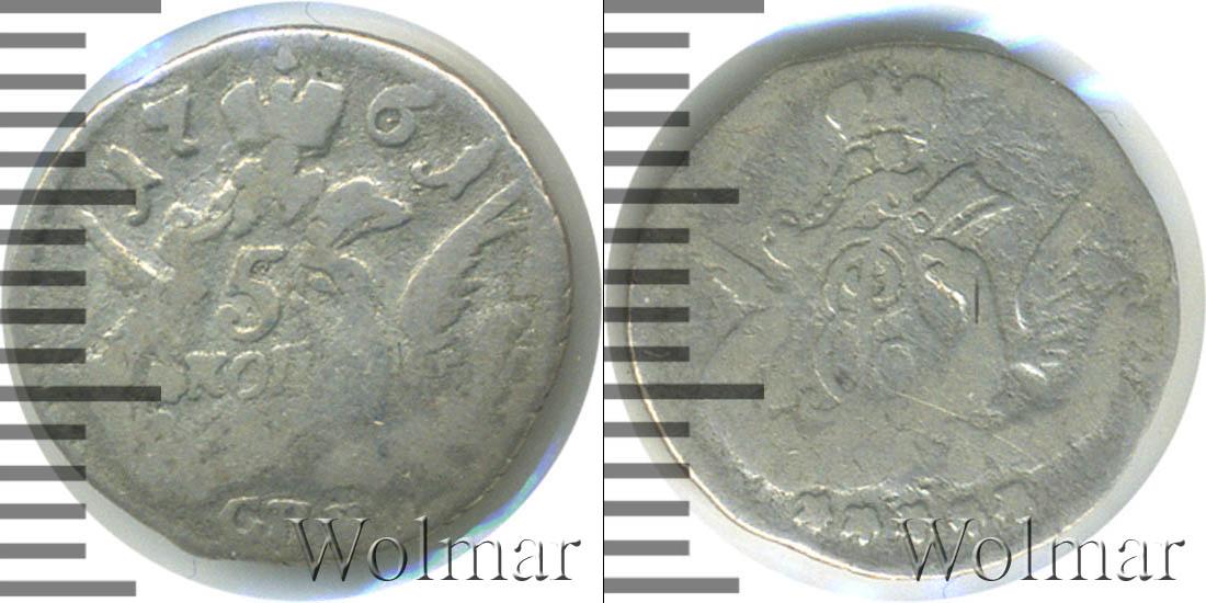 С этой стороны монеты изображен орел, держащий в клюве щит с надписью «5 КОП». Это указание на номинал. Вверху около изображения Большой короны России - дата эмиссии партии «1761», а внизу обозначение монетного двора «СПБ».
