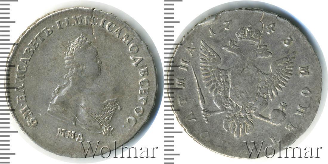 Вдоль верхнего полукруга указан титул правительницы Елизаветы I. «Б•М•ЕЛИСАВЕТЪ•I•IМП•IСАМОД•ВСЕРОС» огибает портрет императрицы. Под профилем государыни мелким шрифтом указан оттиск товарного знака Санкт-Петербургского монетного двора.