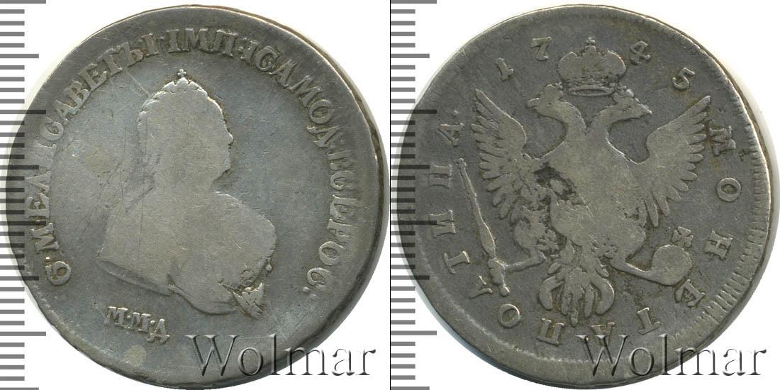 Императрица Елизавета I изображена в профиль в центре диска. Погрудный портрет правительницы сверху огибает надпись «Б•М•ЕЛИСАВЕТЪ•I•IМП•IСАМОД•ВСЕРОС». Внизу композиции указан товарный знак Санкт-Петербургского монетного двора.