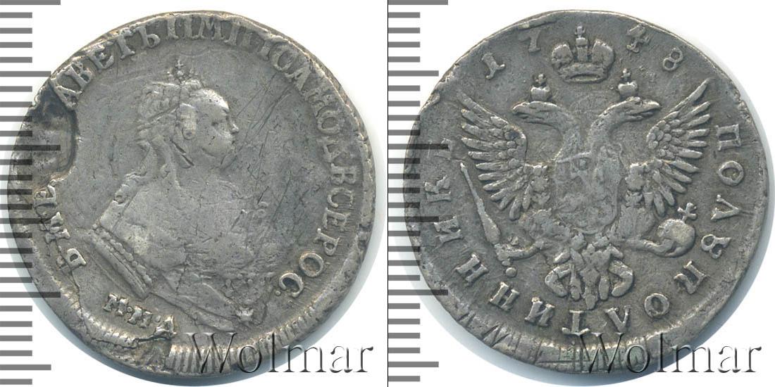 Вверху полукругом выгравировано: 1748. Это указание на дату эмиссии монеты. По центру Государственный герб Российской Империи (двуглавый орел со скипетром и державой). Внизу мы видим указание на номинал: «ПОЛУПОЛТИННИК».
