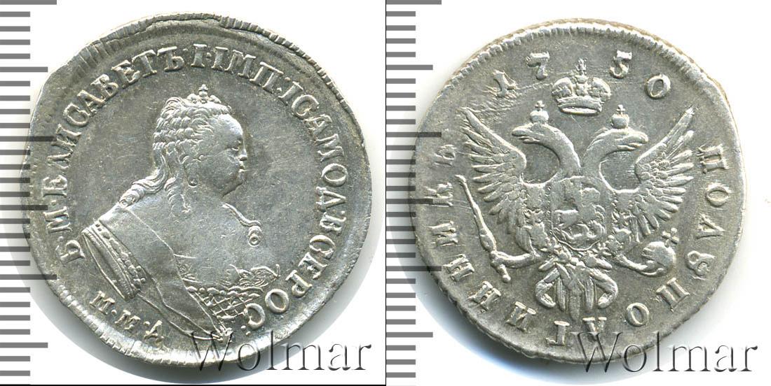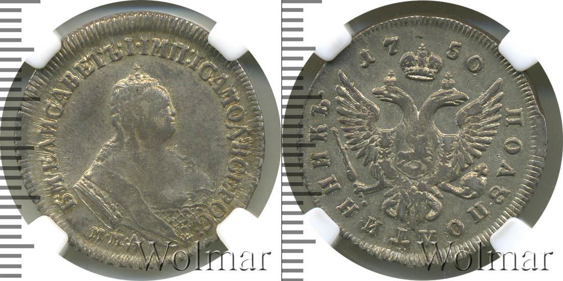 По краю диска вверху расположена надпись«1750» - год выпуска партии серебряных монет. В центре диска Государственный герб Российской Империи, представляющий собой двуглавого орла с короной, скипетром и державой. Вдоль канта выгравировано «ПОЛУПОЛТИННИК». Это номинал монеты.
