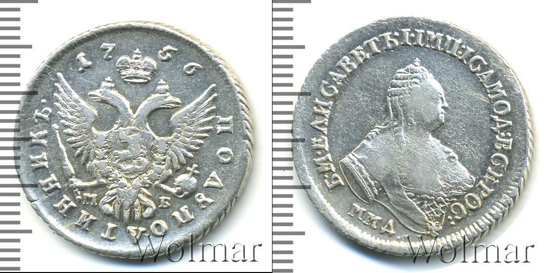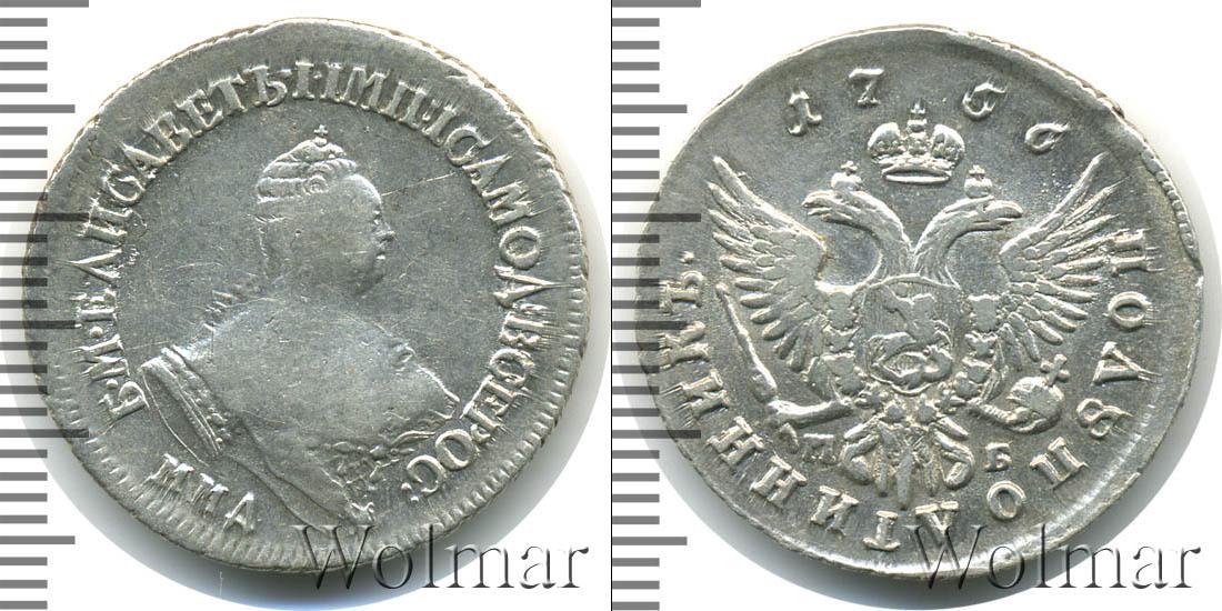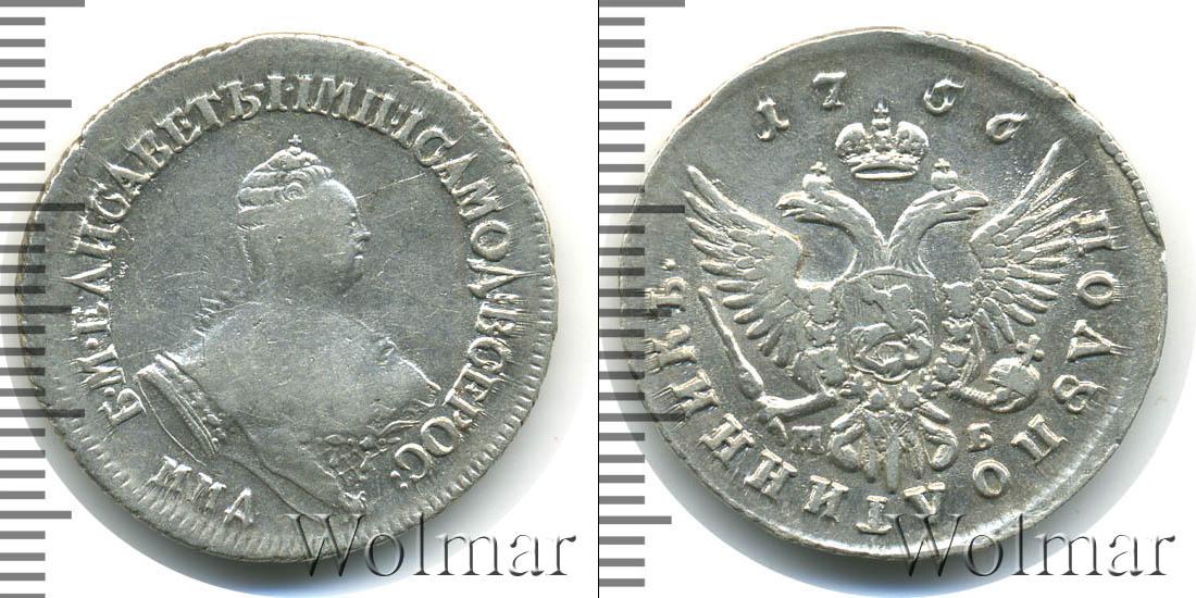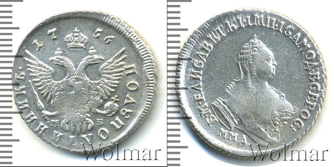 С этой стороны монеты герб России (двуглавый орел со скипетром и державой). Вверху по центру указана дата эмиссии «1756». Отмечены инициалы минцмейстера Михаила Бобровшикова «МБ». В нижней части диска мы видим надпись: «ПОЛУПОЛТИННИК».