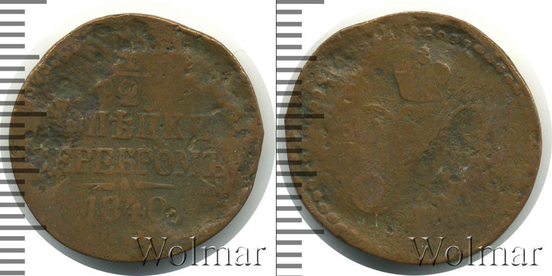 Одна из медных монет императора Николая Первого, отчеканенная на Ижорском монетном дворе. Сверху вниз расположена надпись: 1/2 КОПЕЙКИ СЕРЕБРОМ 1840 С.П.М. Это обозначение номинала, даты эмиссии и монетного двора. Край диска оформлен аналогично аверсу.