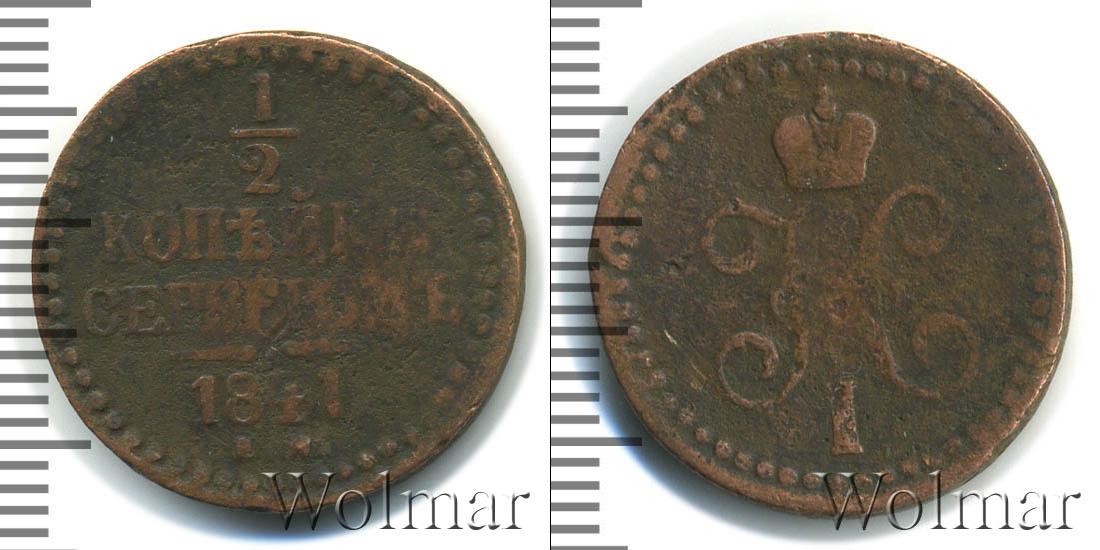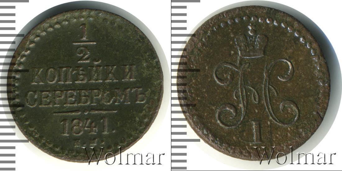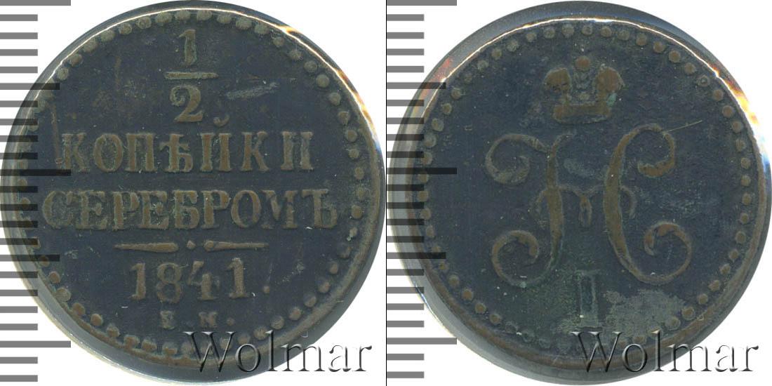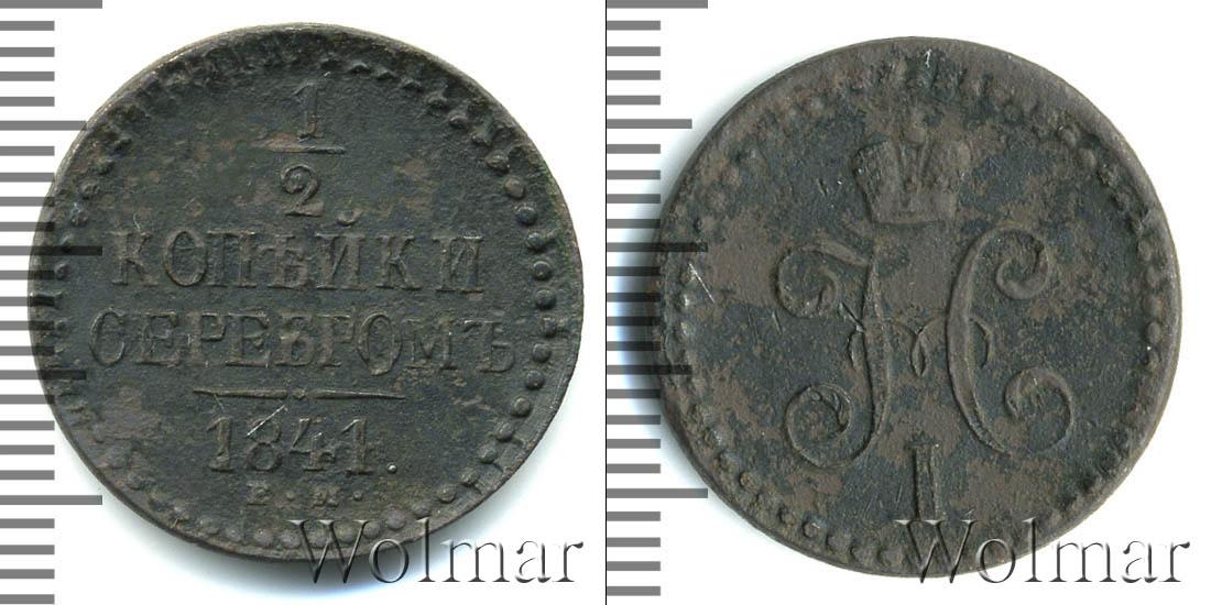 На гладком грунте монеты отчеканены номинал, год выпуска партии и монетный двор Екатеринбурга: 1/2 КОПЕЙКИ СЕРЕБРОМ 1841 Е.М. Около даты эмиссии расположена фигурная черта с точкой посередине. По кругу идет точечный орнамент.