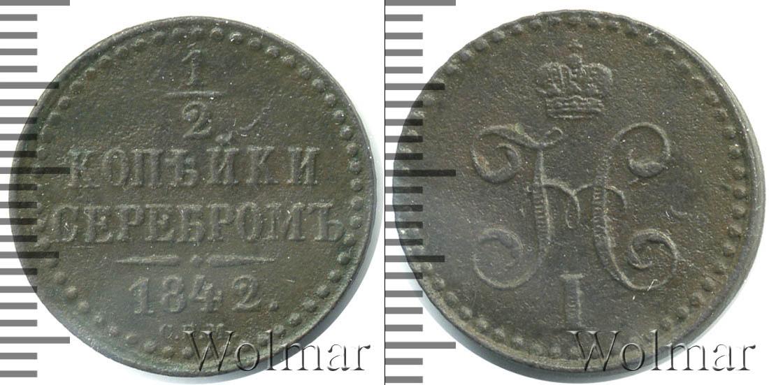 Вдоль канта идет узор из множества точек, обрамляющий надпись в четыре строки: 1/2 КОПЕЙКИ СЕРЕБРОМ 1842. (дата эмиссии партии медных монет и номинал). Внизу под фигурной чертой отмечен Ижорский монетный двор – С.П.М.