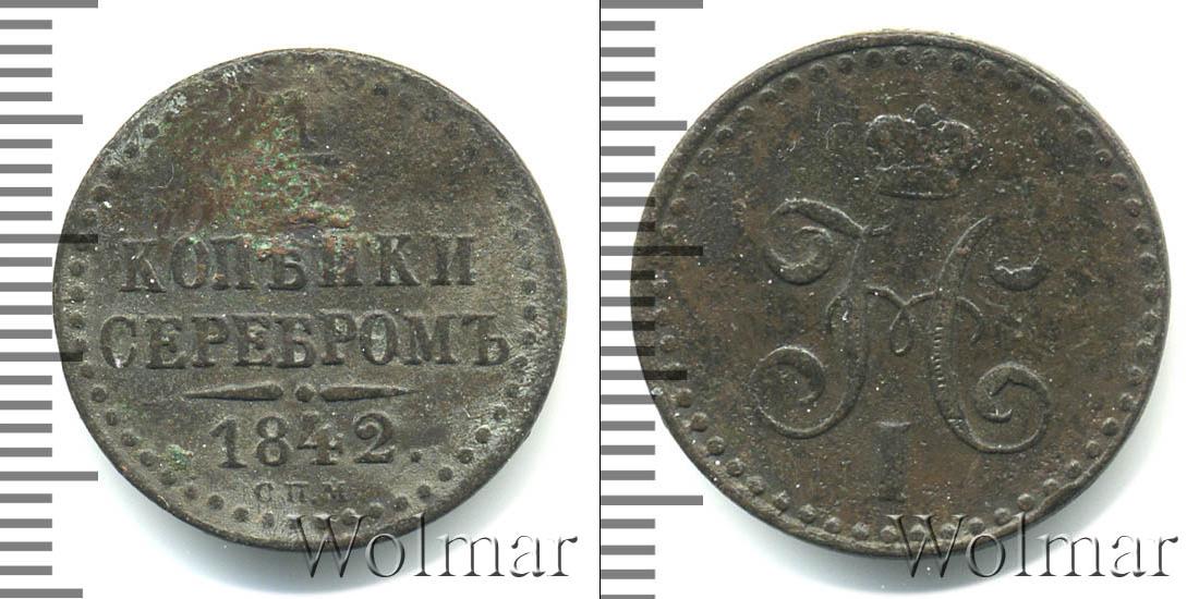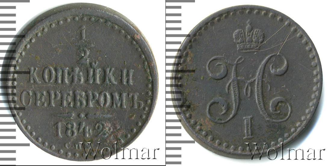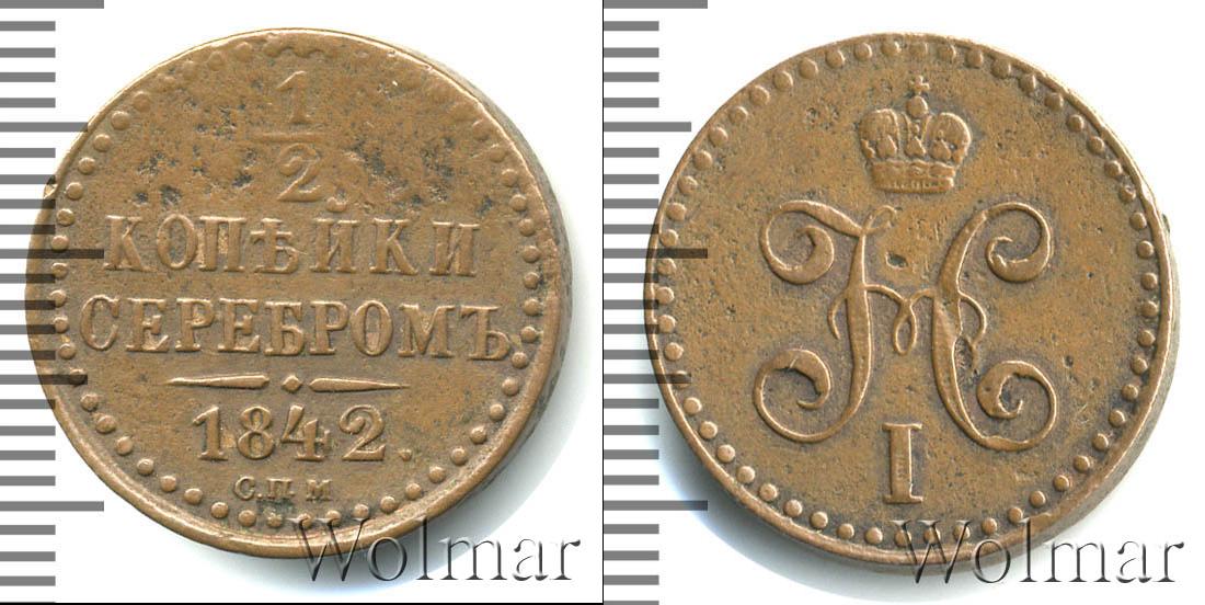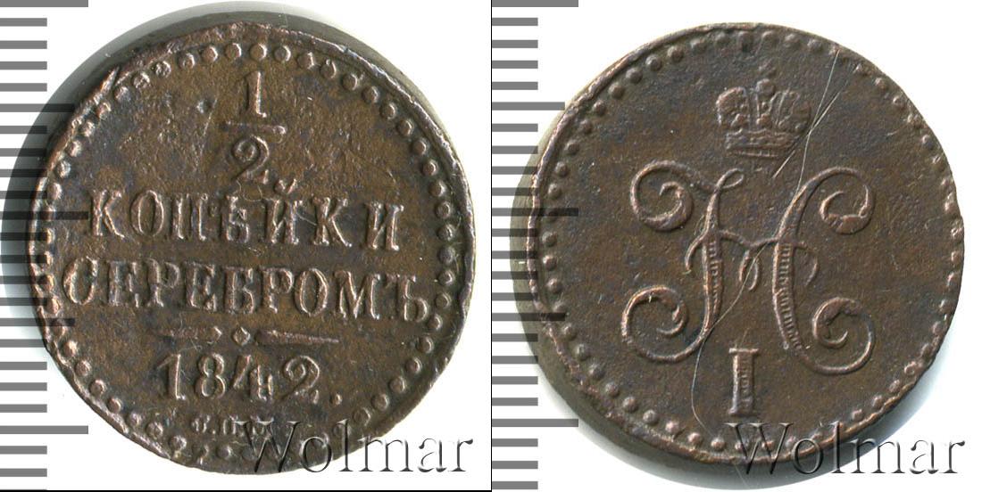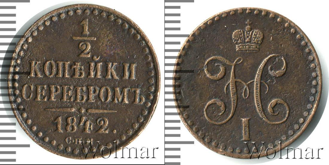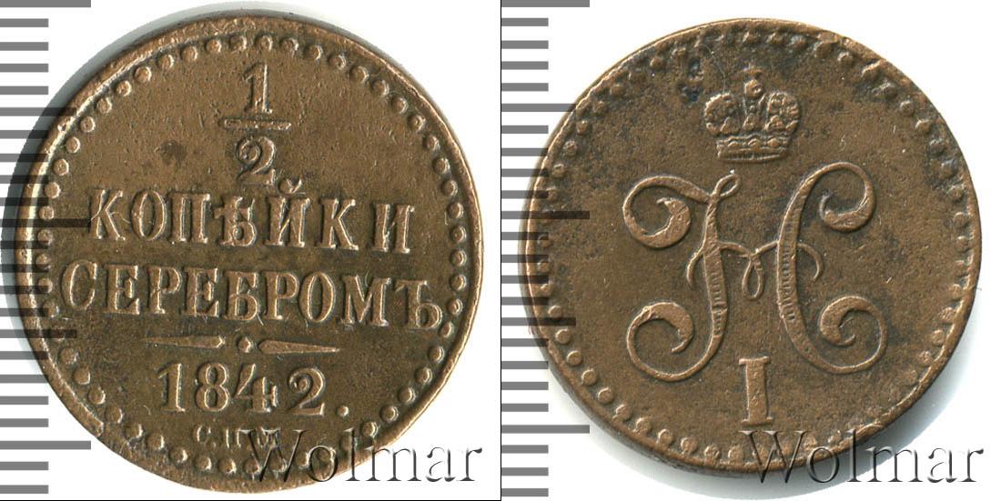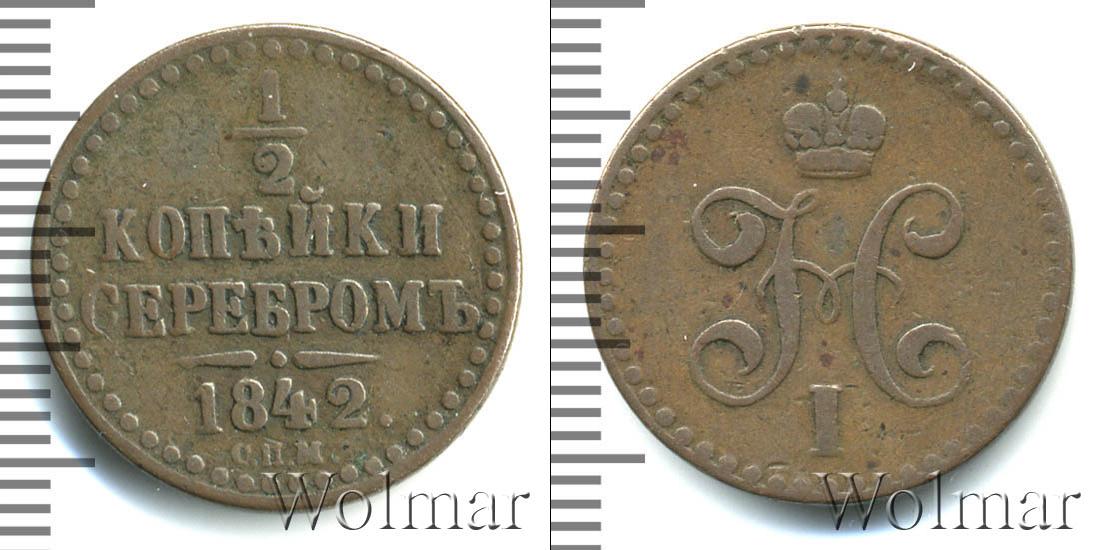 Вдоль канта идет узор из множества точек, обрамляющий надпись в четыре строки: 1/2 КОПЕЙКИ СЕРЕБРОМ 1842. (дата эмиссии партии медных монет и номинал). Внизу под фигурной чертой отмечен Ижорский монетный двор – С.П.М.