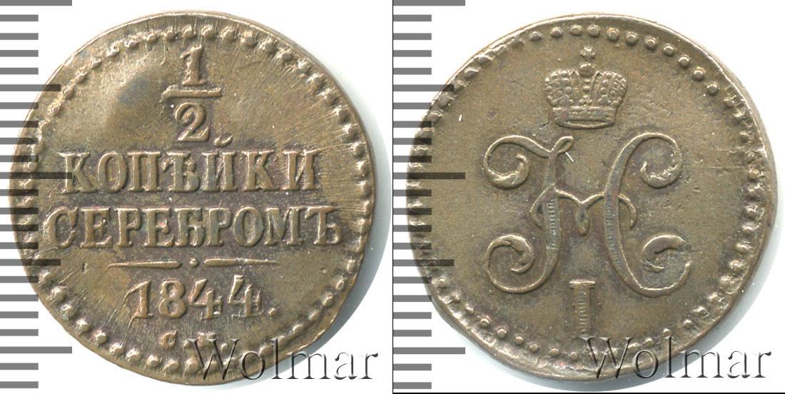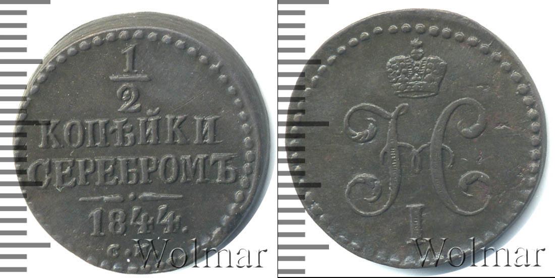 Одна из тиражных монет императора Николая I. Вверху указан номинал монеты: 1/2 КОПЕЙКИ СЕРЕБРОМ. Ниже год выпуска партии 1844. А под фигурной чертой обозначение монетного двора С.М. (Сузунский монетный двор). Диск монеты украшает точечный орнамент.