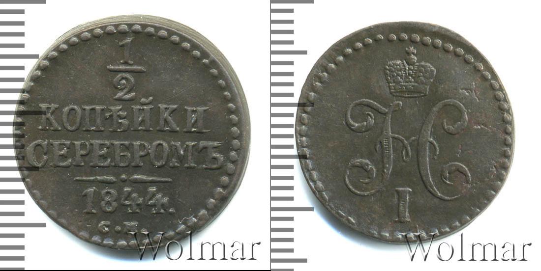 Одна из тиражных монет императора Николая I. Вверху указан номинал монеты: 1/2 КОПЕЙКИ СЕРЕБРОМ. Ниже год выпуска партии 1844. А под фигурной чертой обозначение монетного двора С.М. (Сузунский монетный двор). Диск монеты украшает точечный орнамент.