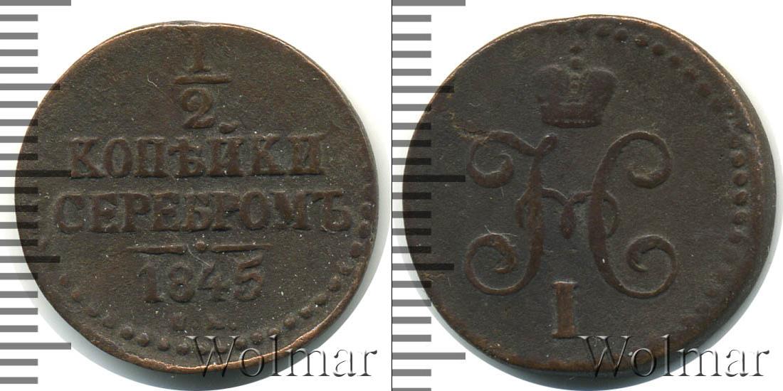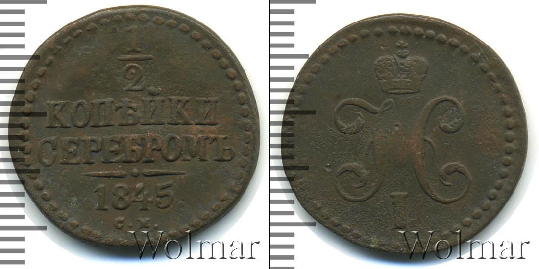 Сверху вниз расположена надпись: 1/2 КОПЕЙКИ СЕРЕБРОМ 1845 С.М. Это обозначение номинала, даты эмиссии и Сузунского монетного двора. Край диска оформлен аналогично аверсу (точечный ободок по всей окружности монеты).