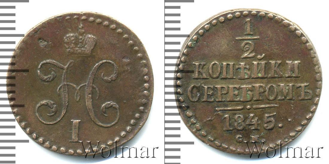 Сверху вниз расположена надпись: 1/2 КОПЕЙКИ СЕРЕБРОМ 1845 С.М. Это обозначение номинала, даты эмиссии и Сузунского монетного двора. Край диска оформлен аналогично аверсу (точечный ободок по всей окружности монеты).