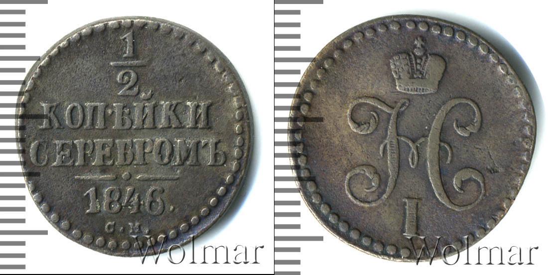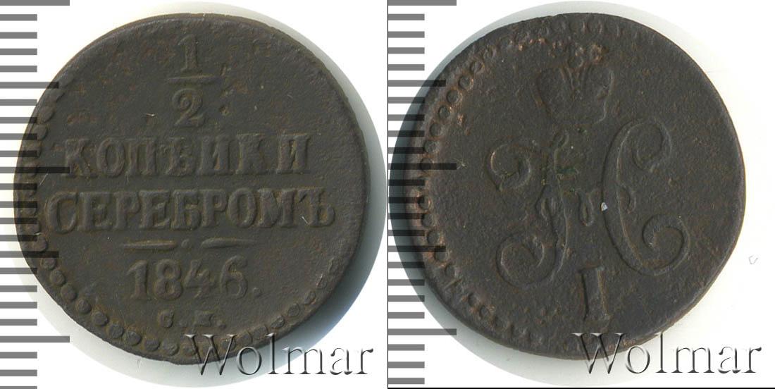 Одна из медных монет императора Николая Первого, отчеканенная на Сузунском монетном дворе. Сверху вниз расположена надпись: 1/2 КОПЕЙКИ СЕРЕБРОМ 1846 С.М. Это обозначение номинала, даты эмиссии и монетного двора. Край диска оформлен аналогично аверсу.