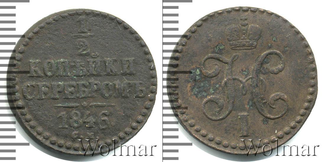 Одна из медных монет императора Николая Первого, отчеканенная на Сузунском монетном дворе. Сверху вниз расположена надпись: 1/2 КОПЕЙКИ СЕРЕБРОМ 1846 С.М. Это обозначение номинала, даты эмиссии и монетного двора. Край диска оформлен аналогично аверсу.