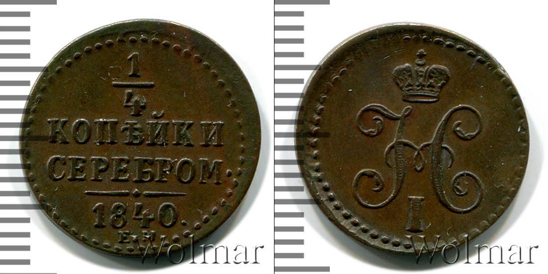 Вдоль канта идет узор из множества точек, обрамляющий надпись в четыре строки: ? КОПЕЙКИ СЕРЕБРОМ 1840 (дата эмиссии партии медных монет и номинал). Внизу под фигурной чертой отмечен монетный двор – Е.М. (Екатеринбургский монетный двор).
