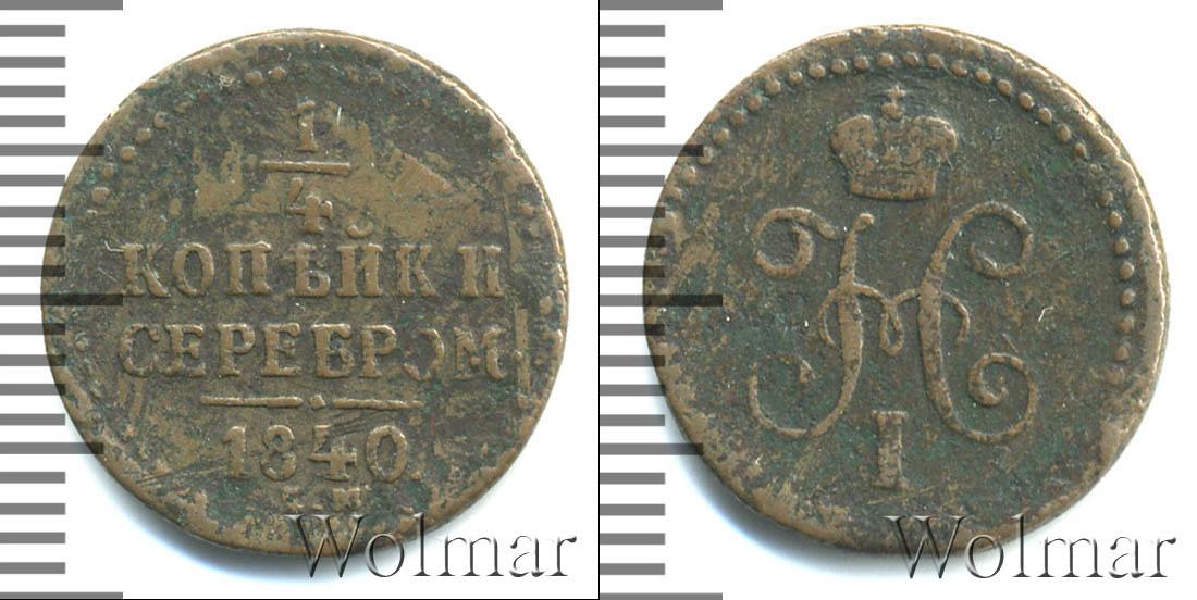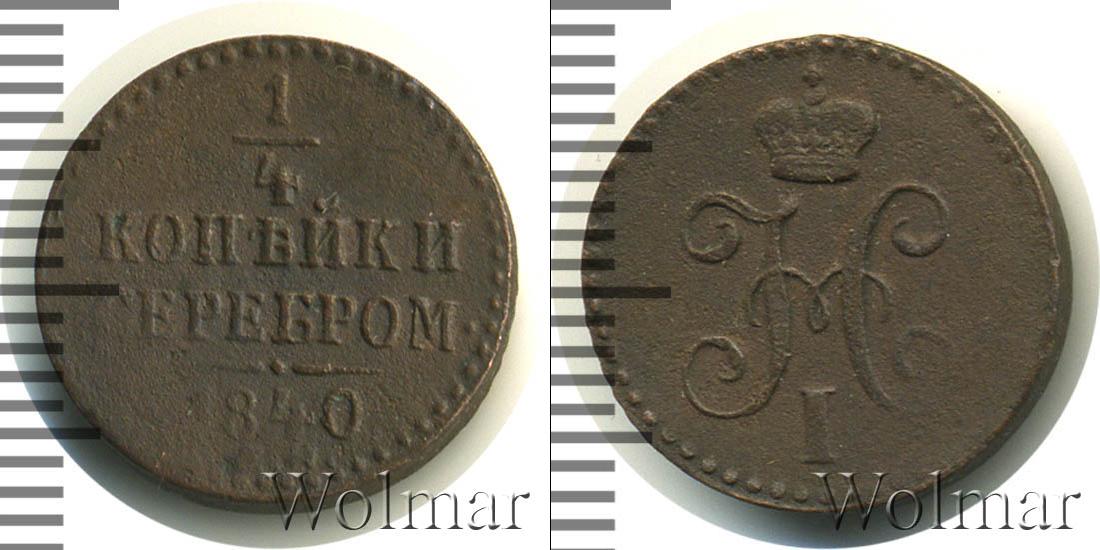 Вдоль канта идет узор из множества точек, обрамляющий надпись в четыре строки: ? КОПЕЙКИ СЕРЕБРОМ 1840 (дата эмиссии партии медных монет и номинал). Внизу под фигурной чертой отмечен монетный двор – Е.М. (Екатеринбургский монетный двор).
