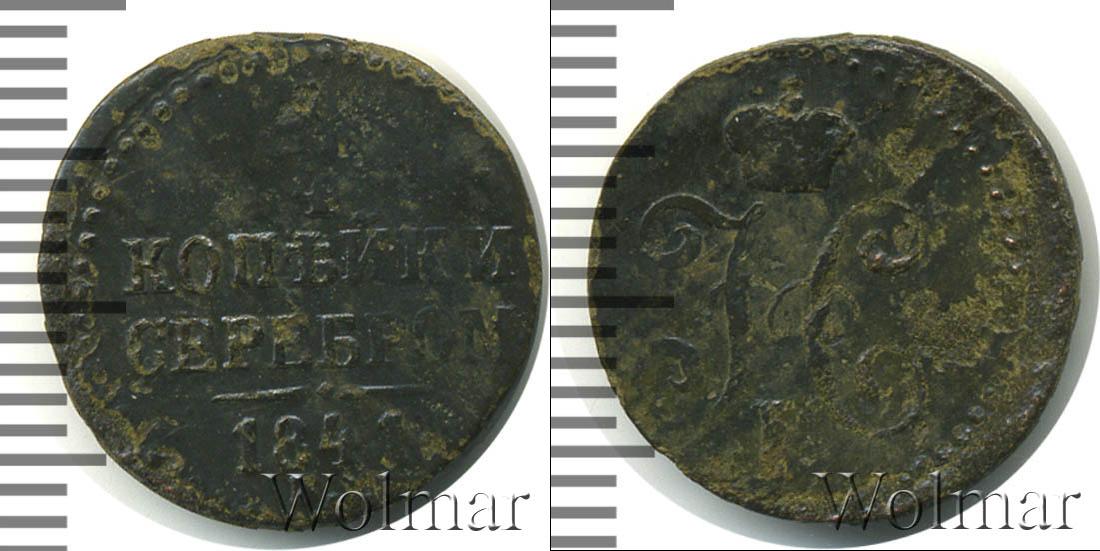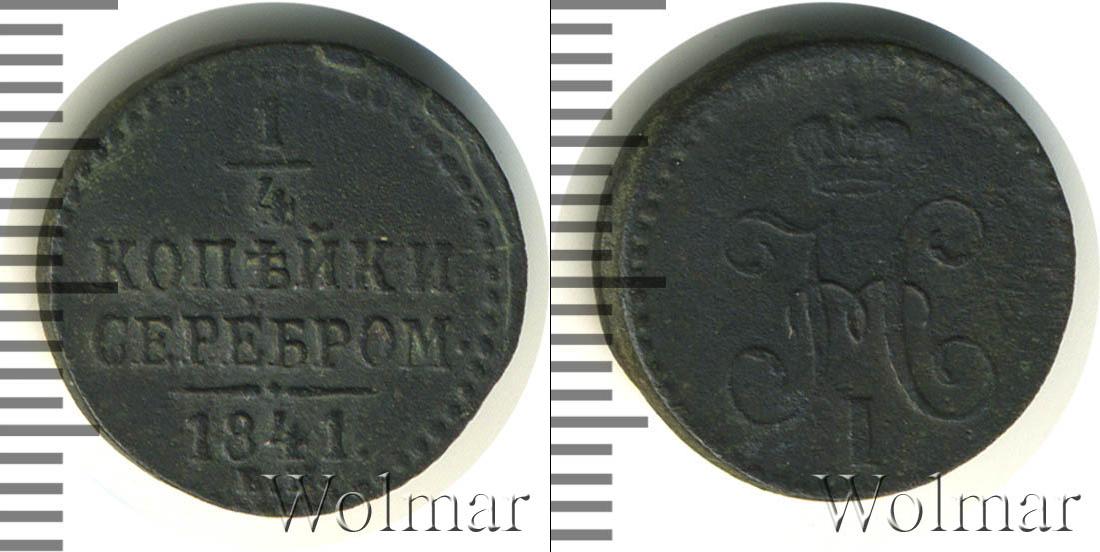 Одна из медных монет императора Николая Первого, отчеканенная на Ижорском монетном дворе. Сверху вниз расположена надпись: ? КОПЕЙКИ СЕРЕБРОМ 1841 С.П.М. Это обозначение номинала, даты эмиссии и монетного двора. Край диска оформлен аналогично аверсу.