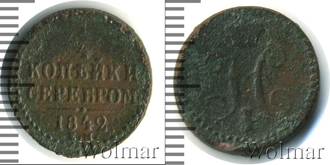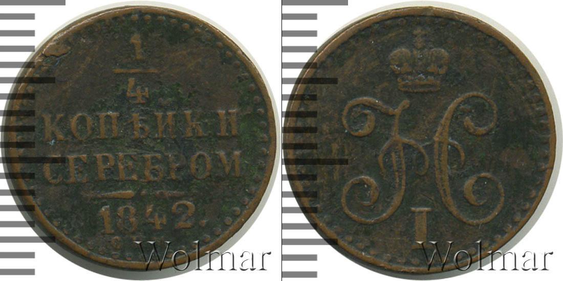 С этой стороны монеты сделаны отметки о номинале, дате эмиссии и монетном дворе Екатеринбурга. Расположена надпись: 1/4 КОПЕЙКИ СЕРЕБРОМ 1842 Е.М.
