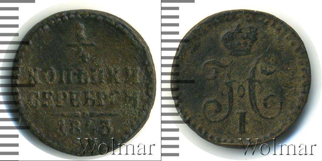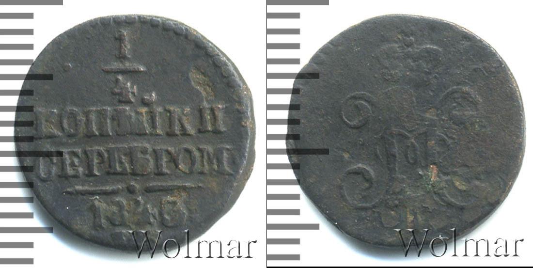 Расположена надпись сверху вниз: 1/4 КОПЕЙКИ СЕРЕБРОМ 1843 Е.М.Это указание на номинал, дату эмиссии и монетный двор Екатеринбурга. Внизу мы видим прямую черту с точкой посередине, а по кругу – точечный узор.