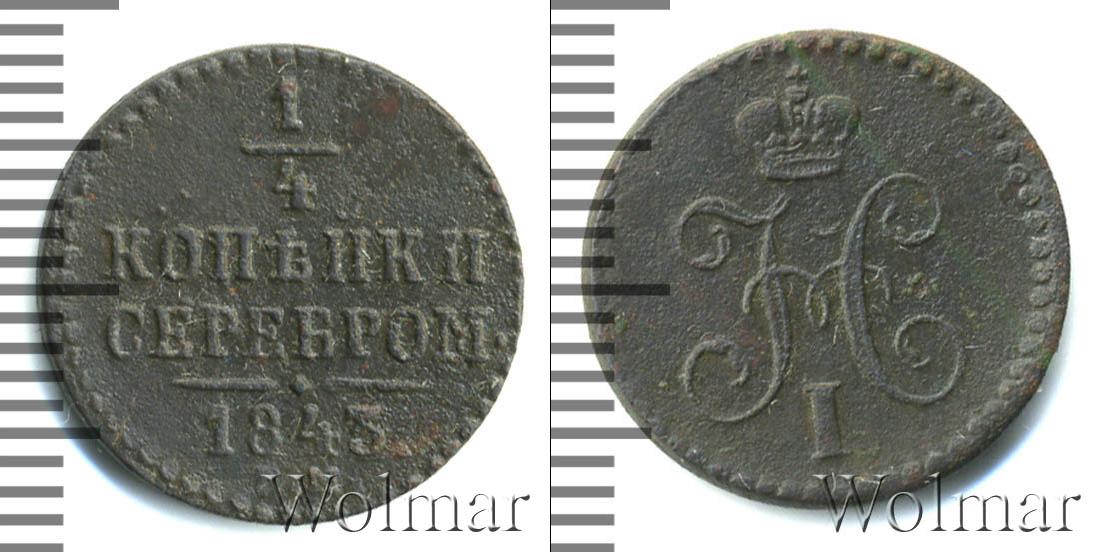 Расположена надпись сверху вниз: 1/4 КОПЕЙКИ СЕРЕБРОМ 1843 Е.М.Это указание на номинал, дату эмиссии и монетный двор Екатеринбурга. Внизу мы видим прямую черту с точкой посередине, а по кругу – точечный узор.