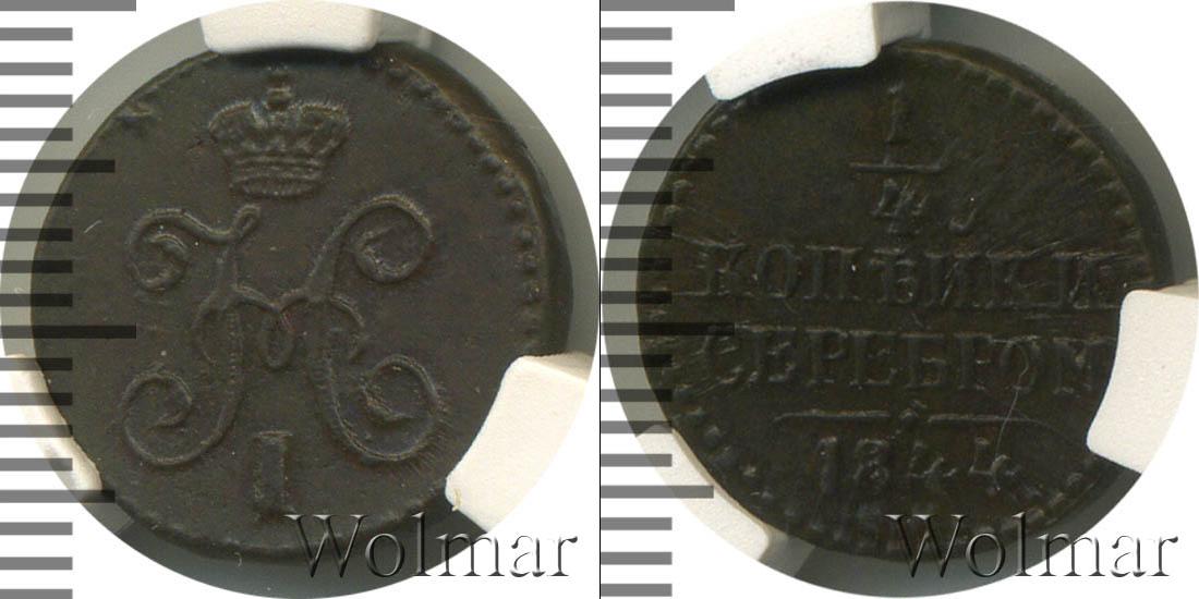 Монета отчеканена из меди. По центру отмечены дата эмиссии, номинал и Сузунский монетный двор: 1/4 КОПЕЙКИ СЕРЕБРОМ 1844 С.М. На диске прямая черта с точкой посередине, а также точечный узор вдоль канта.