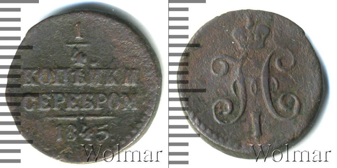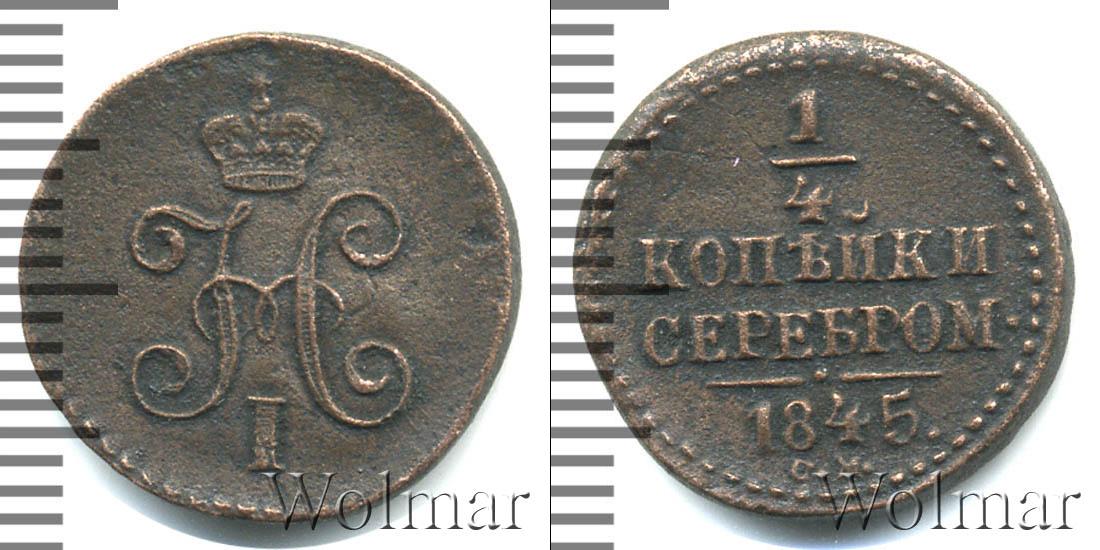 Одна из тиражных монет императора Николая I. Вверху указан номинал монеты: 1/4 КОПЕЙКИ СЕРЕБРОМ. Ниже год выпуска партии 1845. А под фигурной чертой С.М. (Сузунский монетный двор). Диск монеты украшает точечный орнамент.