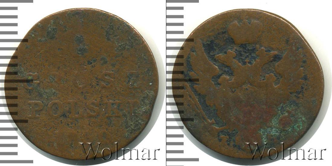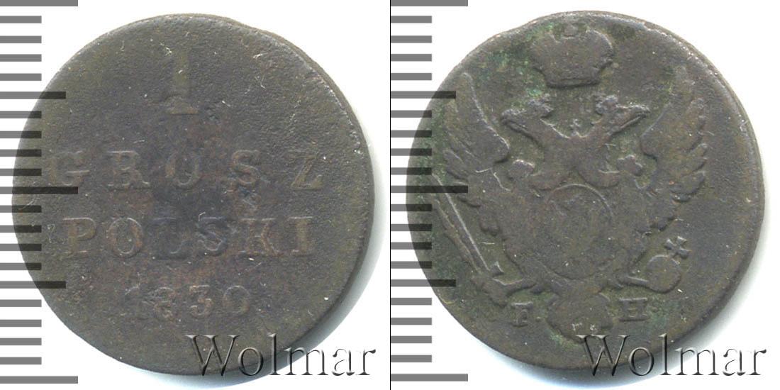 Одна из медных монет императора Николай Первого из династии Романовых (для Польши). На диске расположена надпись о номинале и дате чеканки: 1 GROSZE POLSKIE (польские гроши) 1830 (год выпуска партии).