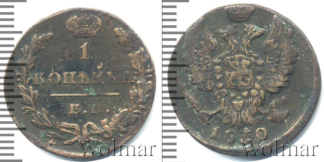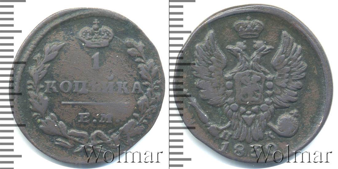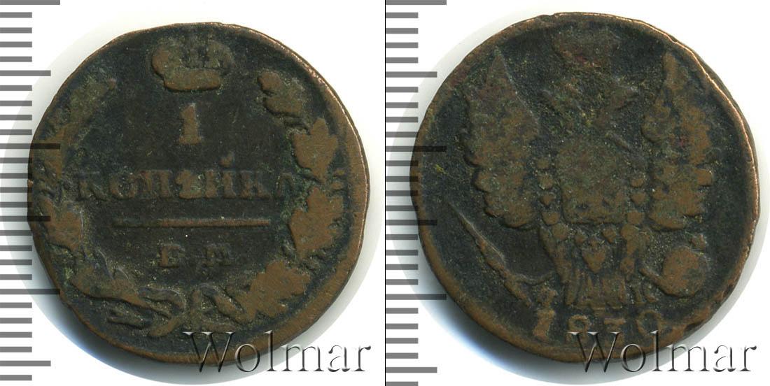 С оборотной стороны монеты: выпуклое изображение лавровой и дубовой ветвей, Большая корона Российской Империи, а также отметки о номинале и монетном дворе: 1 КОПЕЙКА К.М. Вдоль края идет зубчатый орнамент.