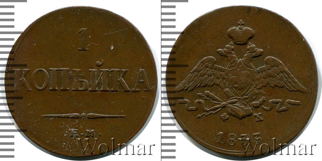 Изображение двуглавого орла с тремя коронами, гербом города Москвы на груди. В лапах он сжимает меч, скипетр и державу. Это гербовая эмблема Российской Империи. Внизу отмечены инициалы минцмейстера Ф.Х., а также дата эмиссии монеты «1833».