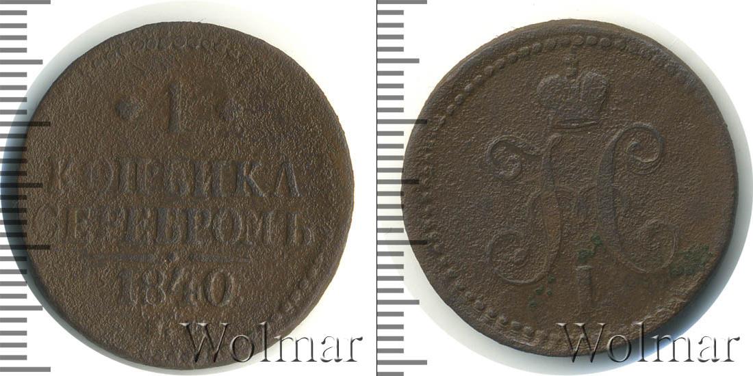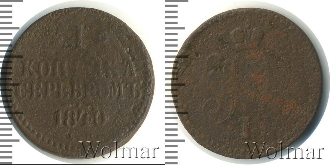 На гладком грунте монеты отмечены номинал, дата эмиссии и Сузунский монетный двор. В центре расположена надпись: 1 КОПЕЙКА СЕРЕБРОМ (фигурная черта с точкой посередине) 1840 С.М. Вдоль канта идет узор из множества точек.