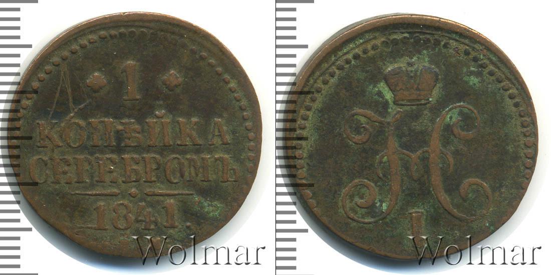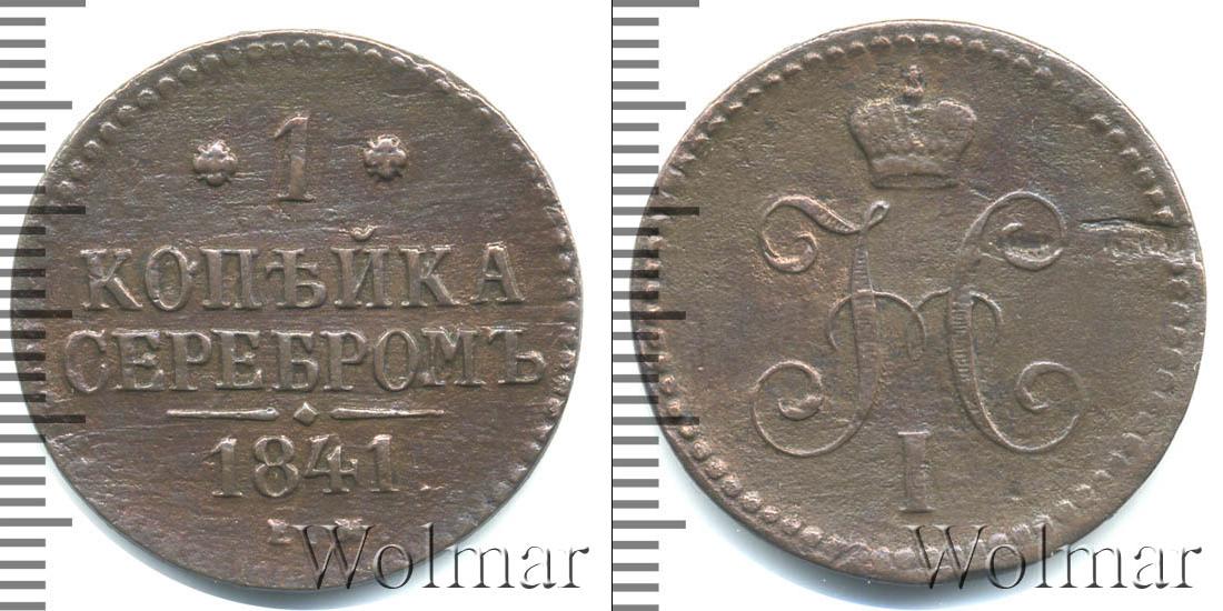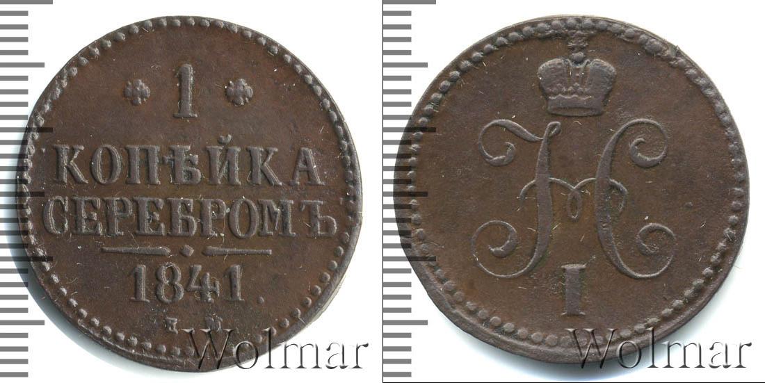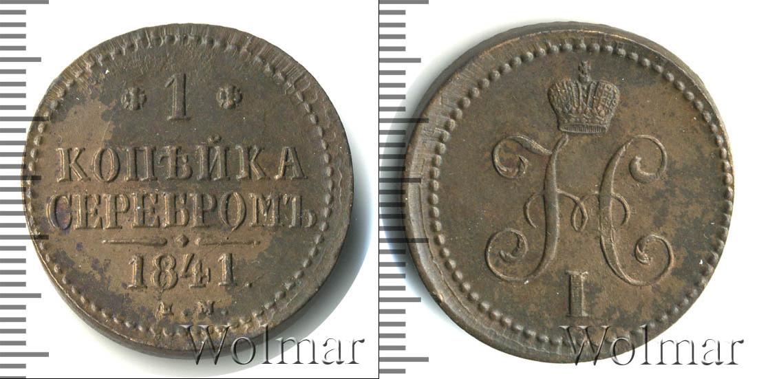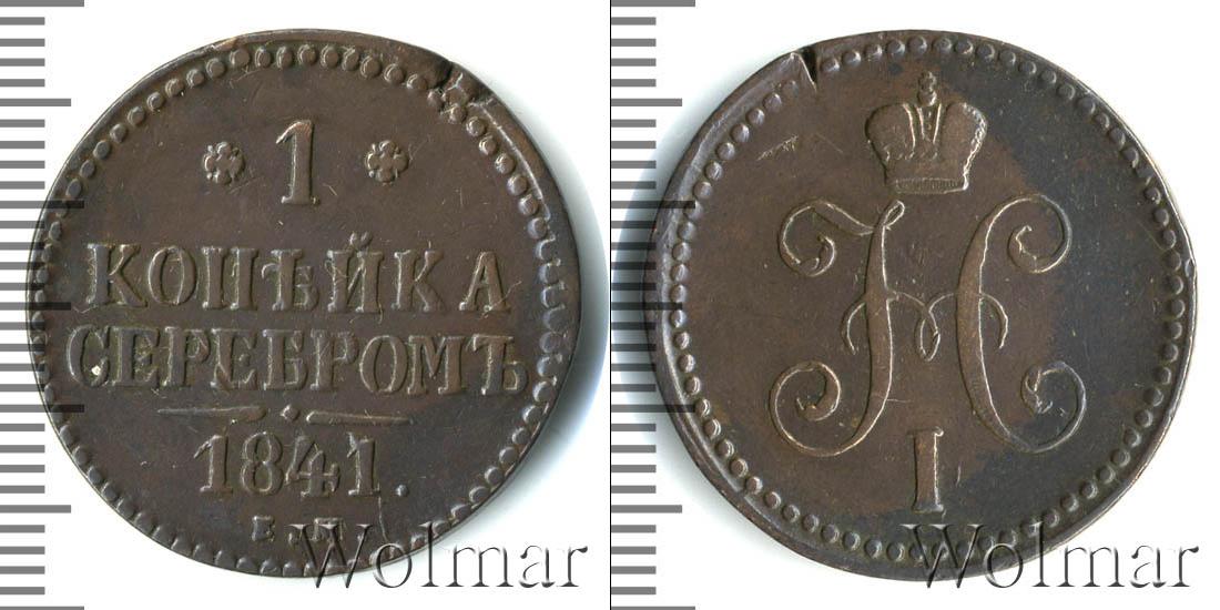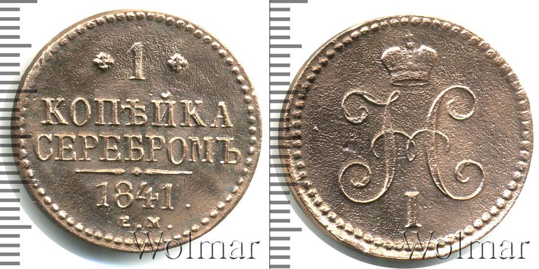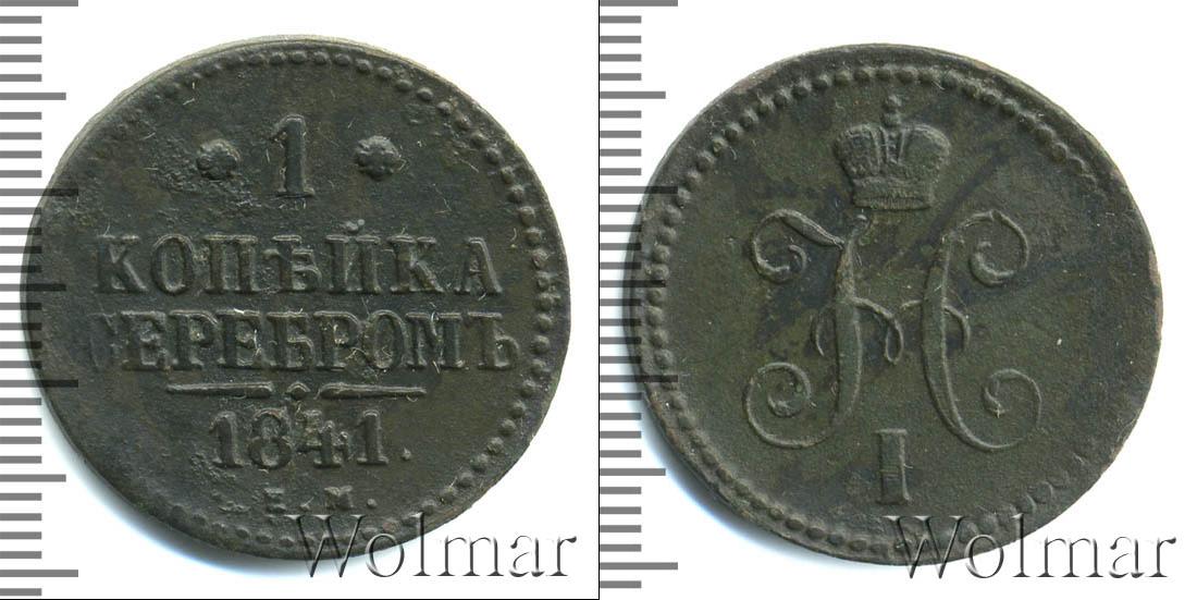 С оборотной стороны монеты мы видим: обозначение Екатеринбургского монетного двора «Е.М.», указание на номинал «1 КОПЕЙКА СЕРЕБРОМ» и год выпуска партии «1841». Диск монеты также украшает точечный ободок и фигурная черта с точкой посередине (она разделяет отметки о номинале и монетном дворе).