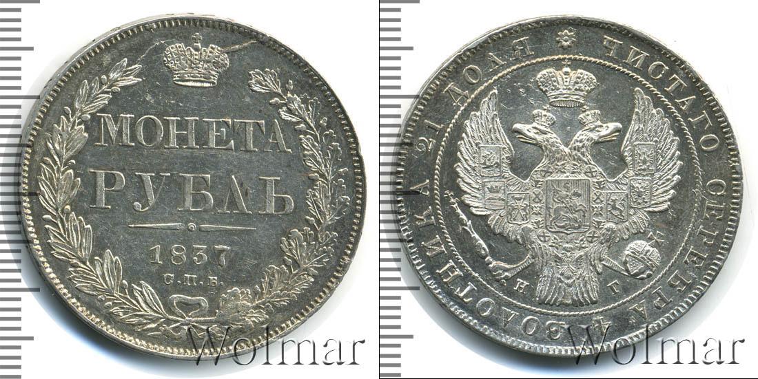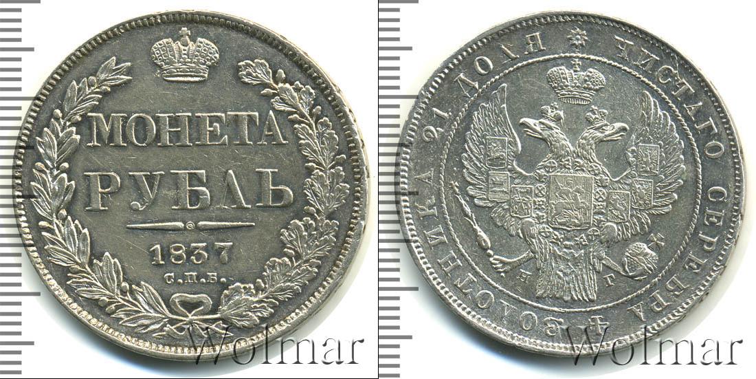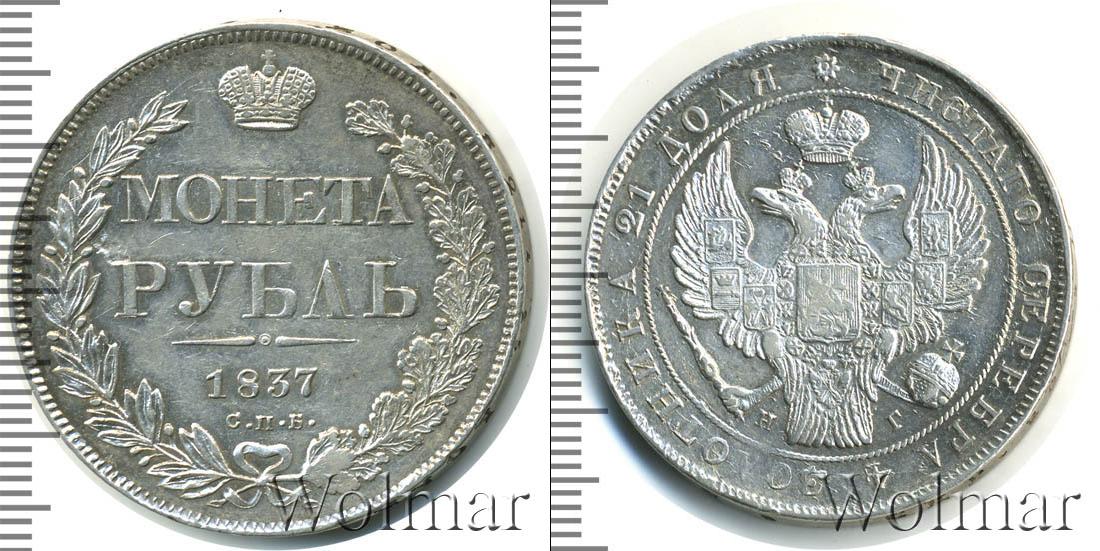 Левая часть реверса украшена гравюрой лавровой ветки, противоположная— дубовой. Вверху диска находится детальное изображение имперской короны. Ниже символа монархии горизонтально вписаны данные об эмиссии: «МОНЕТА РУБЛЬ», «1837», «С.П.Б.».