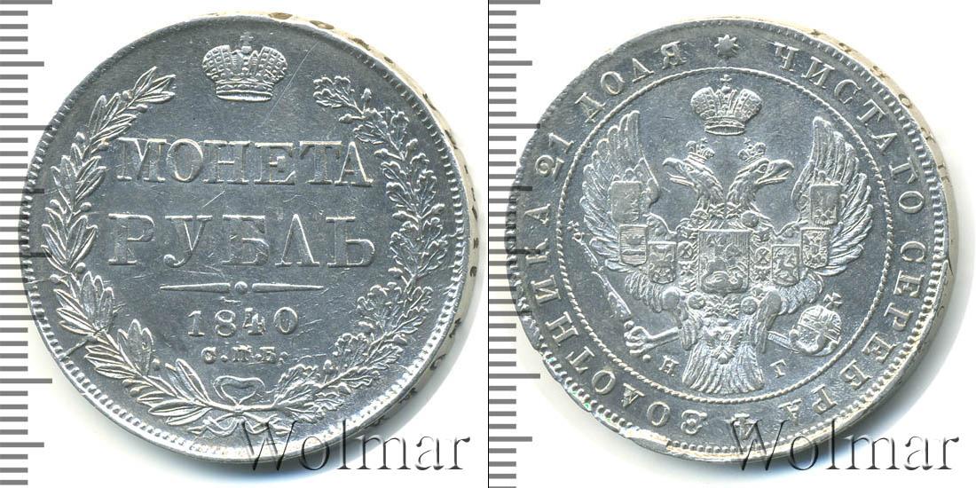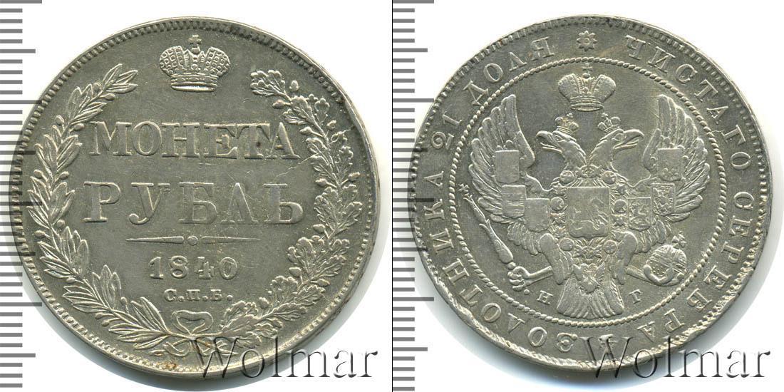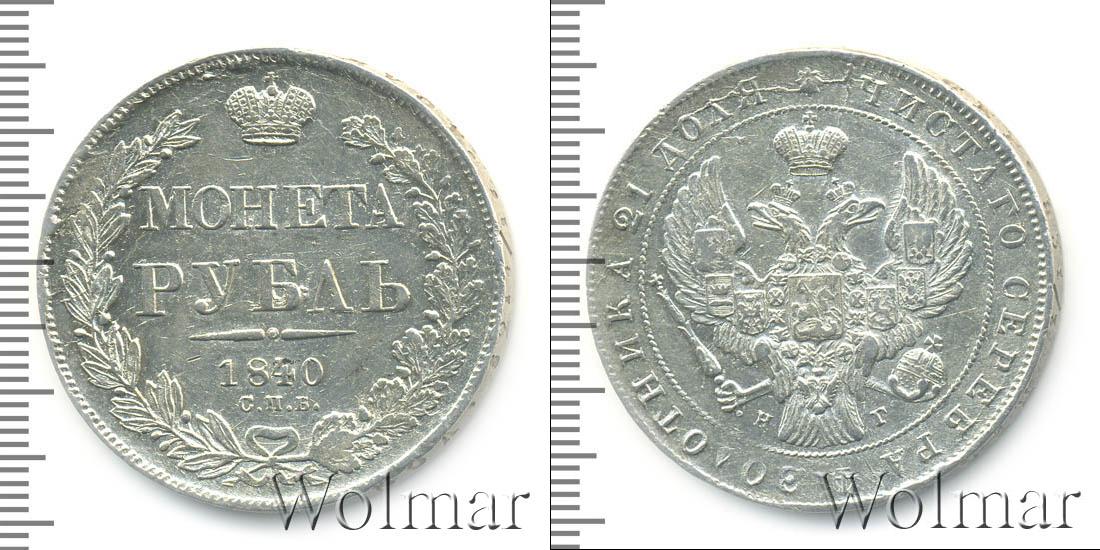 Крупным печатным шрифтом в центре легенды написано «МОНЕТА РУБЛЬ». Выше — изображение имперской короны, ниже - геометрический орнамент и «1840», «с.п.б.». Вдоль нижнего полукруга выгравирован венок из связанных веток лавра и дубового дерева.