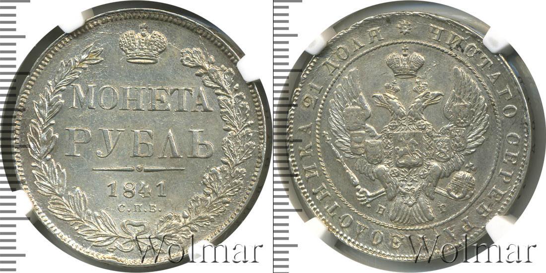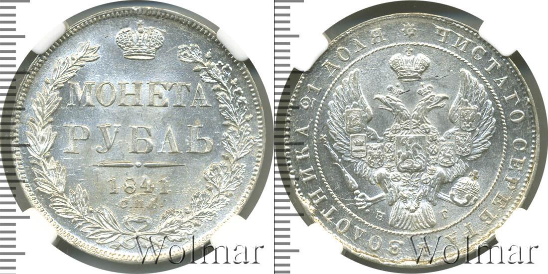 В слабе HHP. Санкт-Петербургский монетный двор. Биткин №# 808.192, "орёл образца 1841", тираж 6 155 000, Уздеников №# 1598, Петров - 1,5 рубля. По каталогу Wolmar # 75/47. 1 рубль СПБ НГ